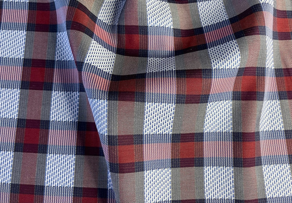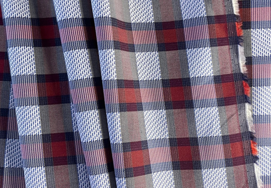 A high-end, 2-ply cotton shirting in a unique wine and bright white plaid with textured, running stitch sky blue accents - this charming shirting is perfect for bespoke shirts, springtime frocks, pajamas, or skirts. Made in Italy. 100% cotton. 58" wide.