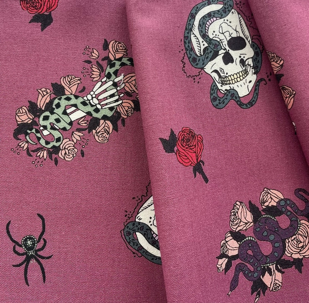 A quilting cotton in a Halloween print of Victorian style skulls, snakes, spiders and roses on a deep mauve pink background - this print is perfect for quilting, full skirts, blouses, garments, napkins, dish towels, or aprons. Made in Japan. 100% cotton. 44" wide.
