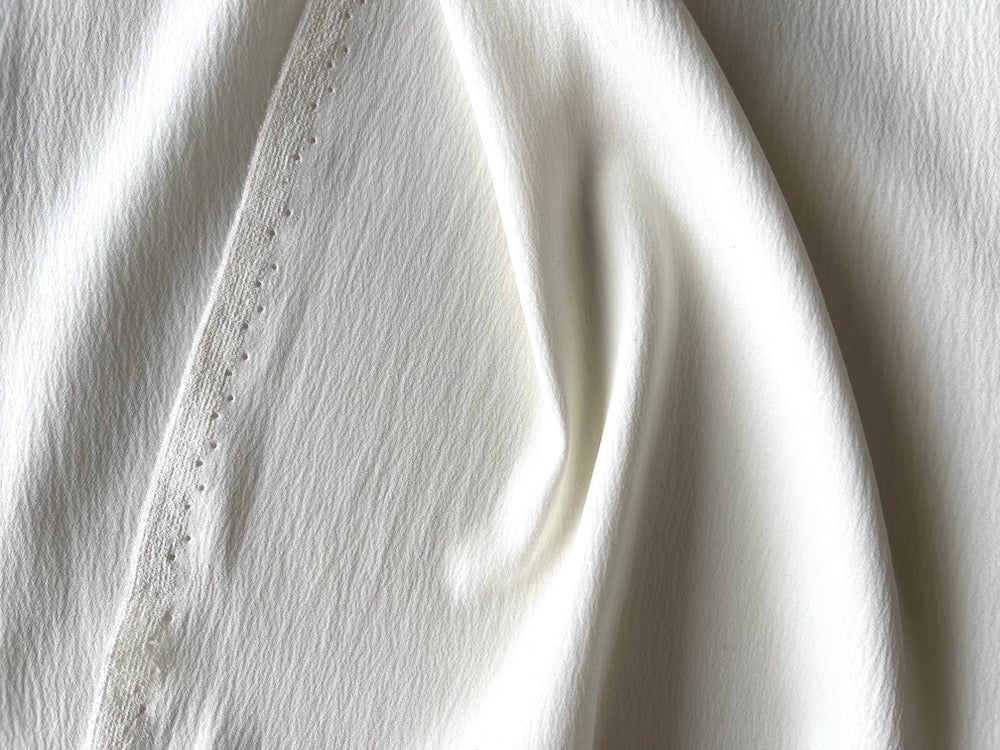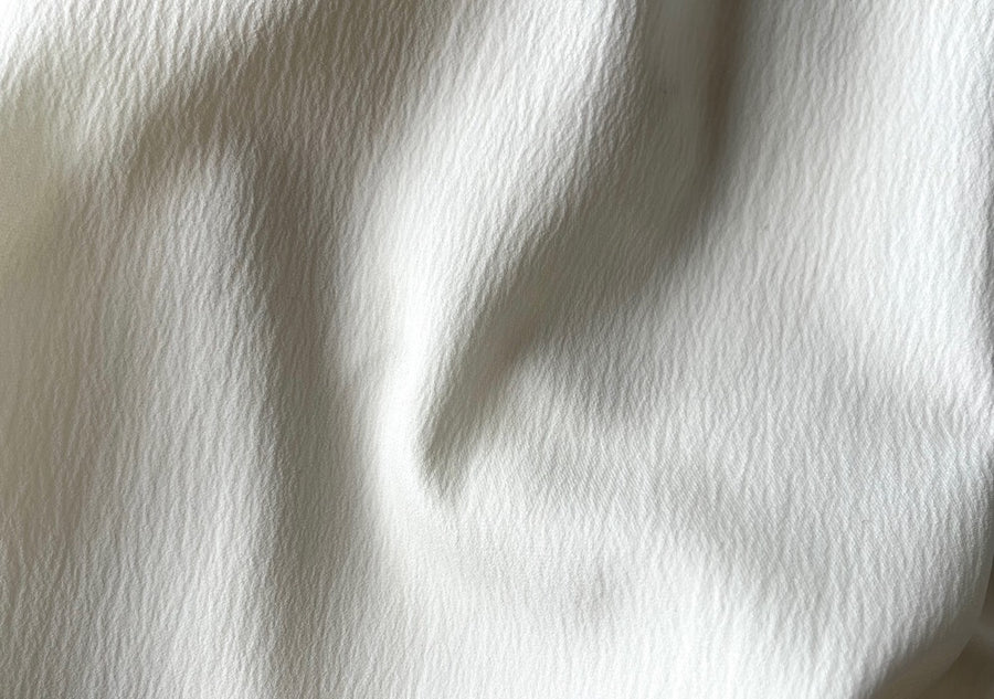 A mid-weight prepared for dyeing (PFD) crinkled, stretch silk in pale ivory - with a touch of lycra, this silk is perfect for dresses, blouses, unique painted garments, dyeing, or slim cigarette pants. Made in Italy. 90% silk and 10% lycra. 52" wide.