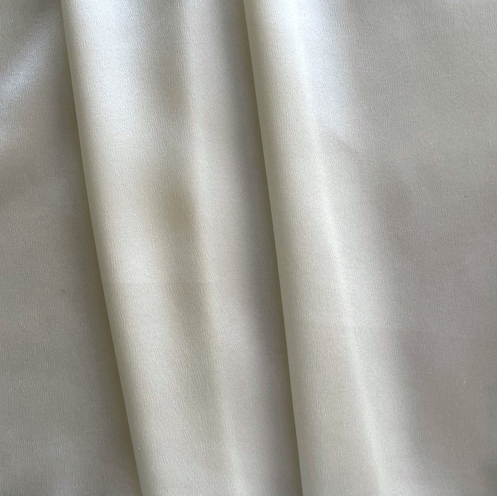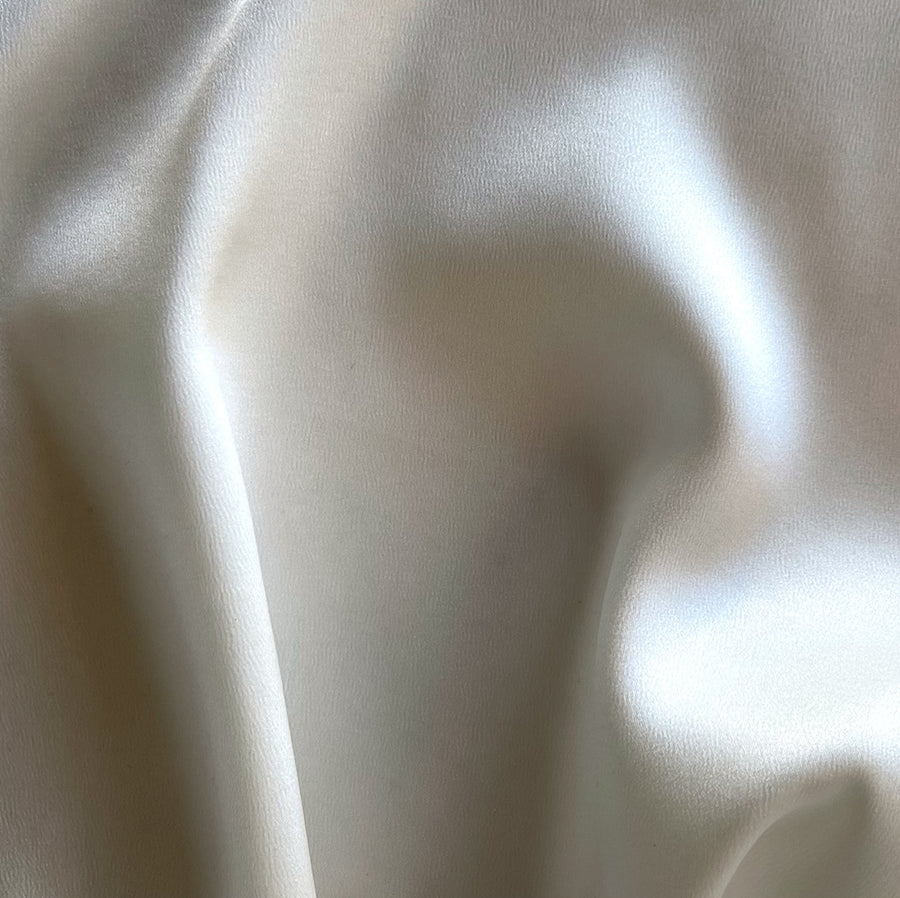 A slightly heavier, gleaming stretch silk satin charmeuse in soft silk white - with a touch of lycra, this fluid silk charmeuse is perfect for bridal wear, blouses, lingerie, wrap tops, anything bias-cut, or vintage-style dresses. Made in Italy. 95% silk and 5% lycra. 54" wide.