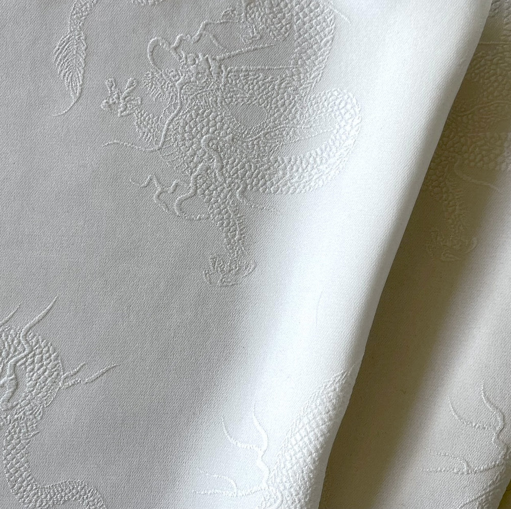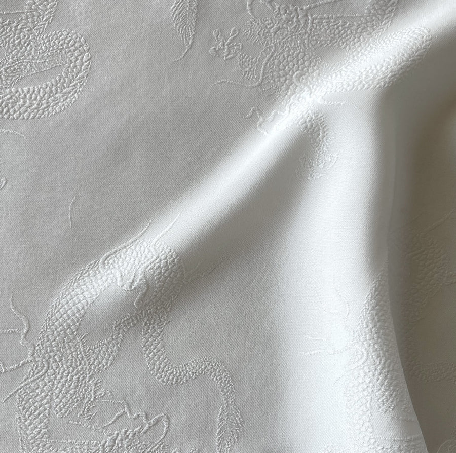 A silk jacquard in an elegant tone-on-tone design of crouching Oriental dragons in powder white - this soft, fluid silk is perfect for lingerie, a bowed blouse, or luxurious linings. 100% silk. 45" wide.