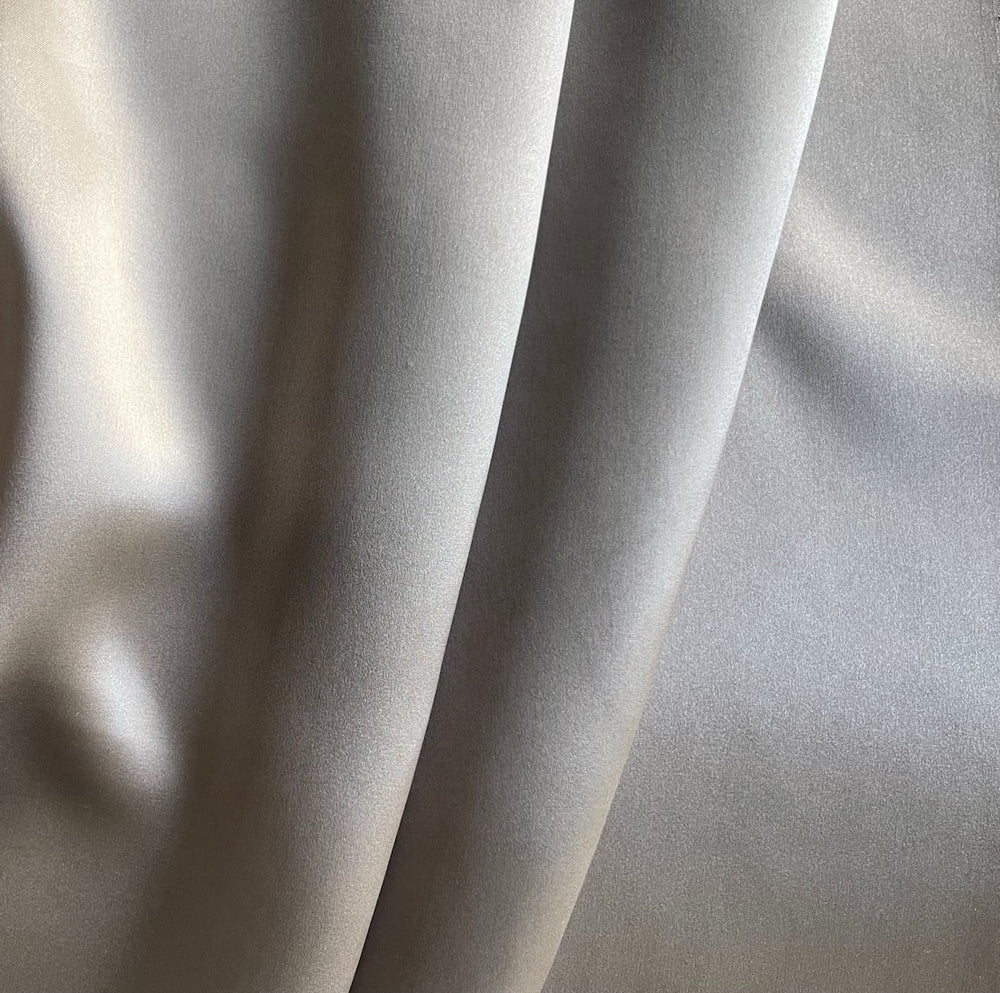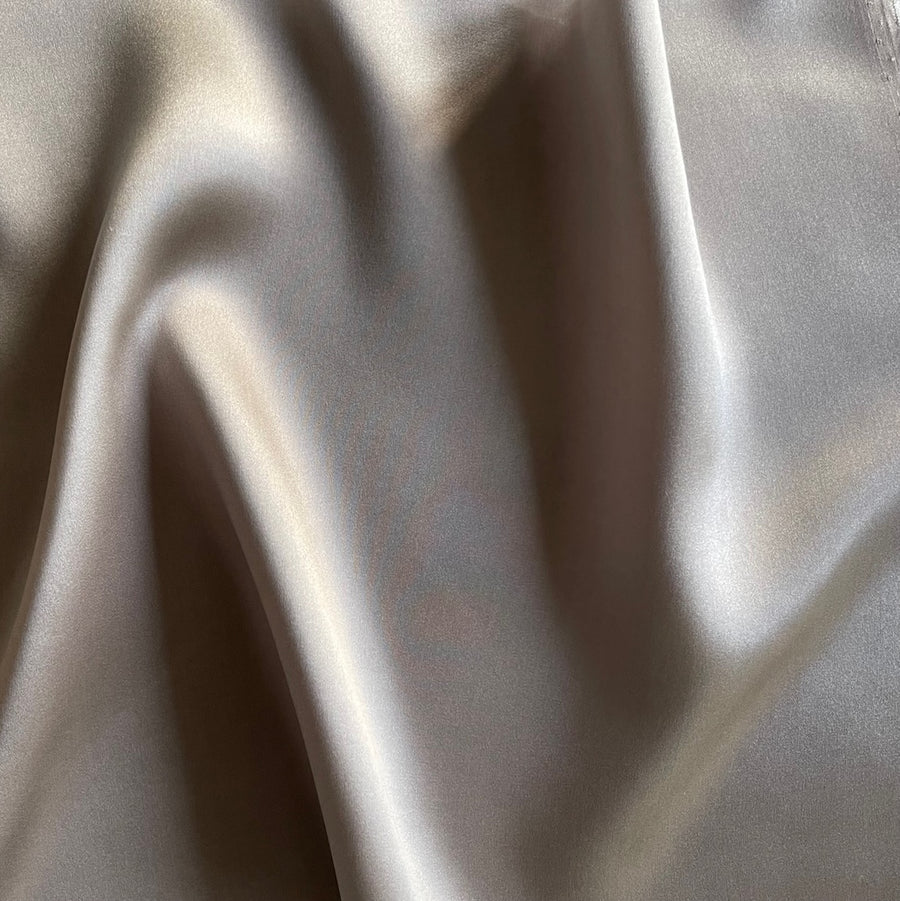 A gleaming silk satin charmeuse in sophisticated greige - this fluid silk charmeuse is perfect for blouses, lingerie, wrap tops, anything bias-cut, or vintage-style dresses. Made in Italy. 100% silk. 55" wide.