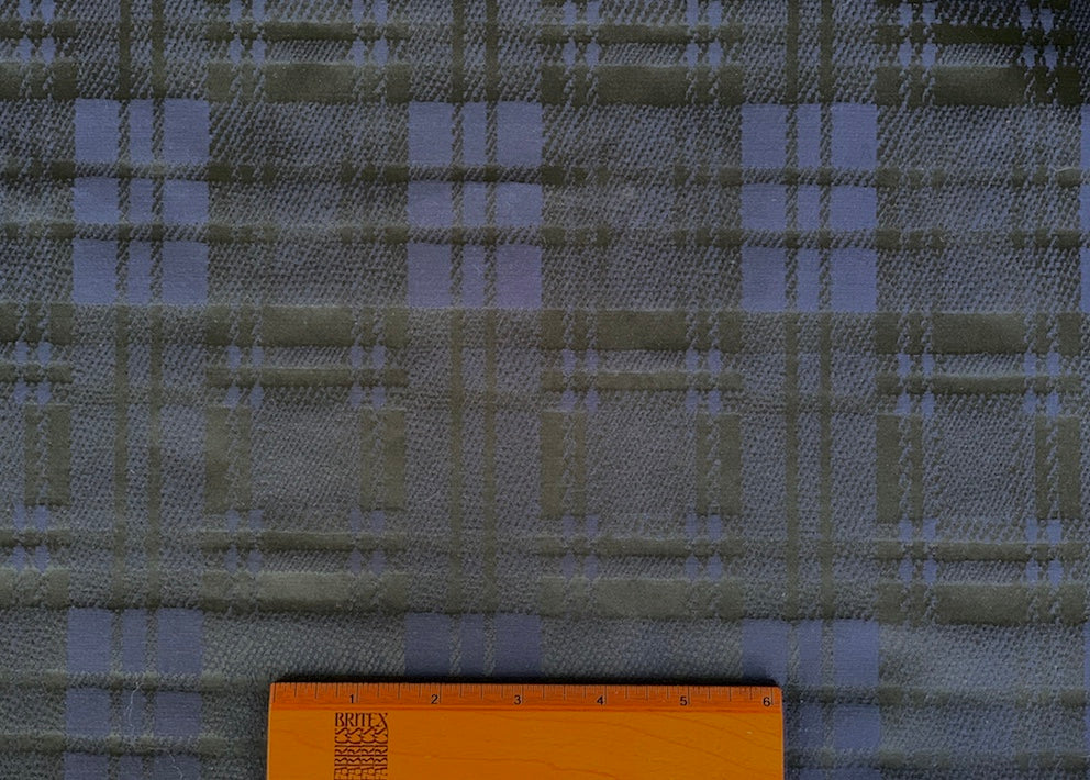 An elegant black and navy plaid silk blend fabric, with a crisp, heavy taffeta finish and weight - perfect for a structured gown or an elegant evening blazer. Made in Italy. 50% silk and 50% polyester blend. 62" wide.