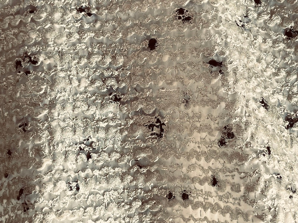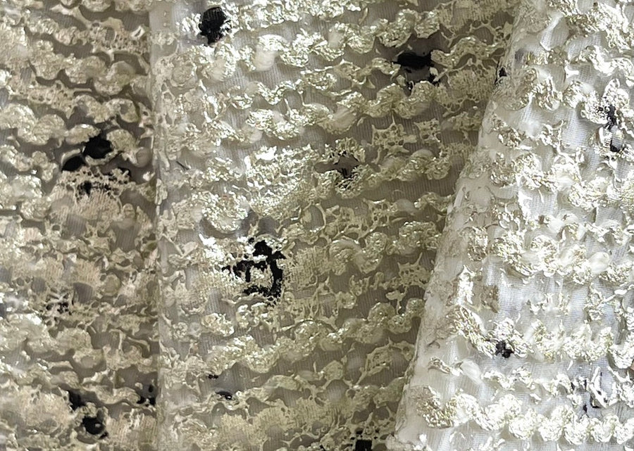 A couture brocade in a unique pattern of pale gold metallic and black on a semi-sheer silk white background - this amazing brocade is perfect for a stately unlined coat, a fabulous short skirt, a oversized jacket with shawl collar, or a stunning opera gown. Made in Italy and used by high-end designer. Polyester, cotton, and acrylic blend. 50" wide.