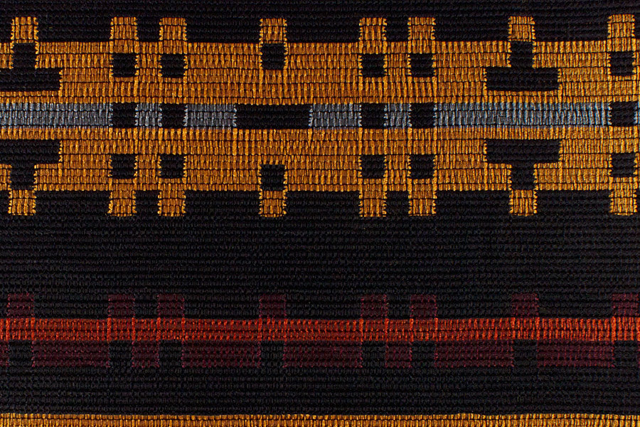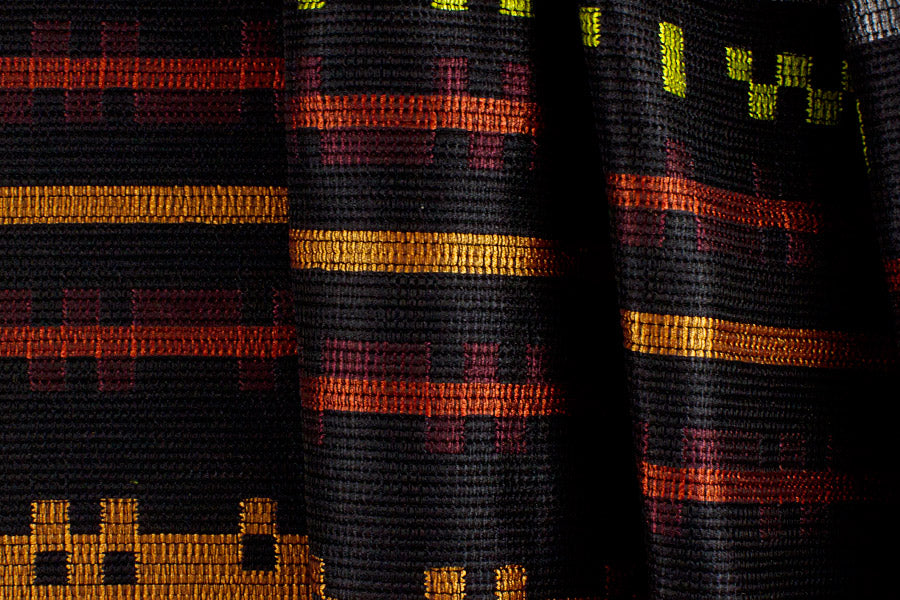 A midweight silk blend woven fabric, with a tight weave and an ethnic influence. This exquisite fabric has crosswise geometric stripes made of fabric ribbon in copper, rust, wine, chartreuse, and silvery grey. Full-bodied and reversible, this would make dramatic wide collared evening coat, or fabulous over sized floor cushions for your den. Made in Italy. 91% Polyester, 9% silk. 56" .