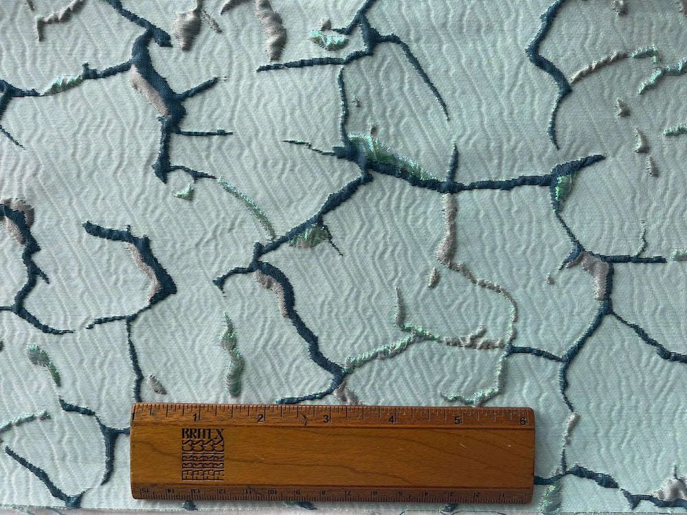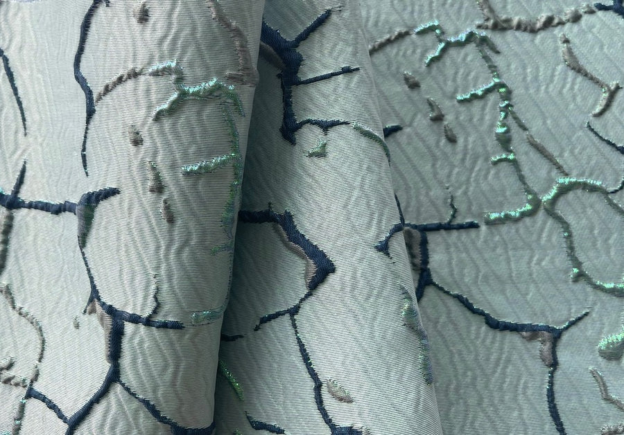 A metallic polyester blend brocade in an organic pattern reminiscent of branches and twigs in textured, iridescent wintergreen, aqua, and peacock on a pistachio background - this stunning brocade would be fabulous for special occasion dresses, an evening coat, hostess skirts, or tops. Made in Italy. Polyester and acrylic. 57" wide