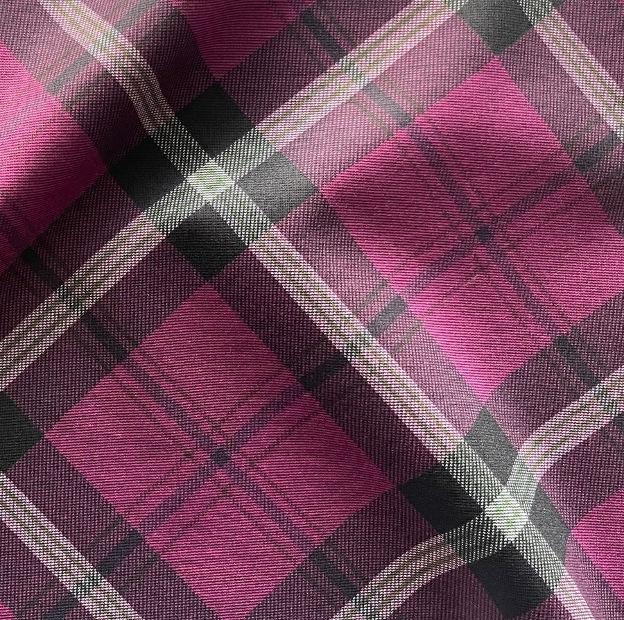 A mid-weight rayon viscose blend ponte double-knit in a diagonal boysenberry plaid with plum, black, and white accents - with a touch of lycra for comfort, this smooth, supple ponte knit is breathable, cool to the touch, and perfect for travel-wear, tailored slacks, tunics, and sheath dresses. Made in Italy. 45% rayon viscose, 50% polyester, and 5% lycra. 60" wide.
