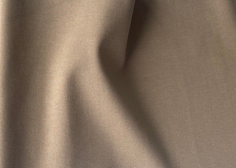A mid-weight rayon viscose blend ponte double-knit in neutral British khaki  - with a touch of lycra for comfort, this smooth ponte knit is breathable and perfect for travel-wear, tailored slacks, tunics, and sheath dresses. 68% rayon viscose, 28% nylon, and 4% lycra. 59" wide.
