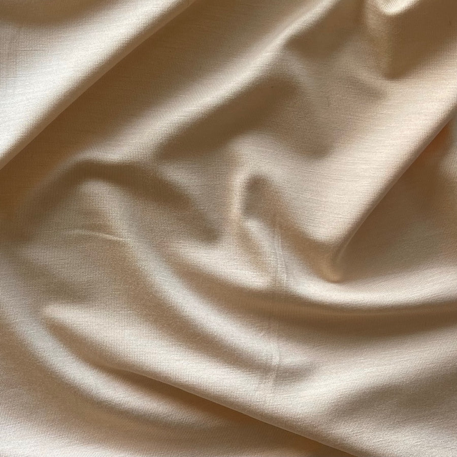 A drapey, rayon viscose jersey knit in pale apricot sorbet - with a touch of lycra for comfort, this knit is sinuous, fluid, and perfect for travel-wear, tops, T-shirts, skirts, wrap dresses, swimsuit wrap, or lounge-wear. 97% rayon viscose and 3% lycra. 65" wide.