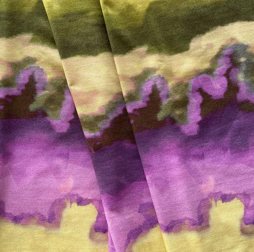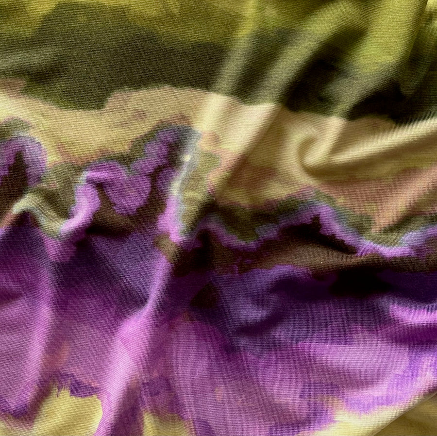 A drapey, rayon viscose jersey knit in crosswise irregular organic strips in shades of olive, flaxen yellow, amethyst and lavender - with a touch of lycra for comfort, this knit is sinuous, fluid, and perfect for travel-wear, tops, T-shirts, skirts, wrap dresses, swimsuit wrap, or lounge-wear. Made in Italy. 96% rayon viscose and 4% lycra. 56" wide.
