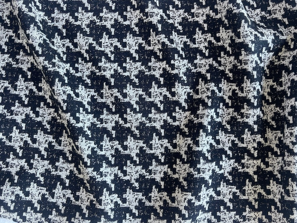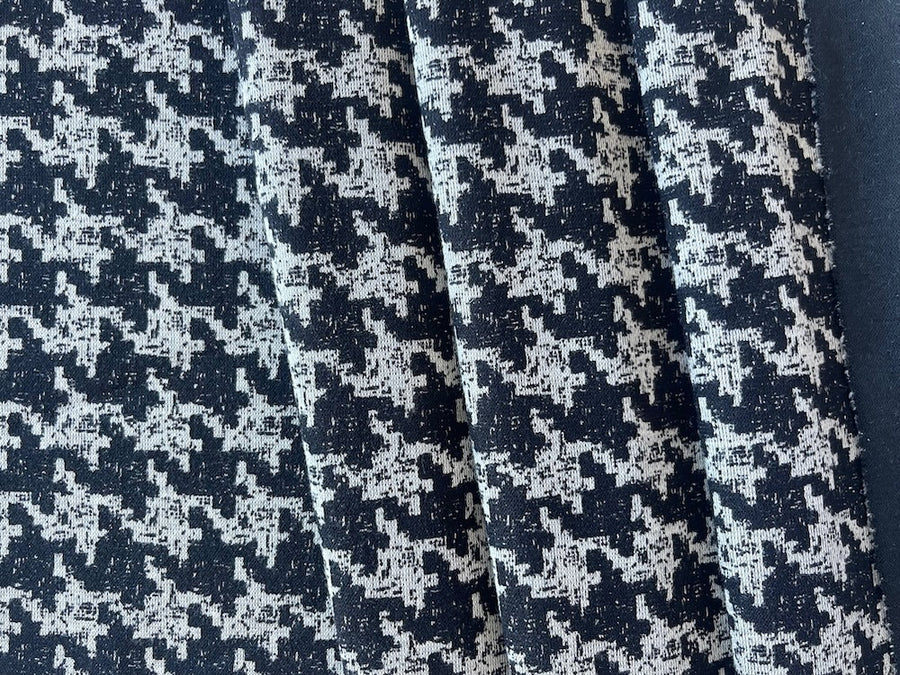 A light to mid-weight rayon viscose blend ponte knit in a coal black and light ivoryr houndstooth - with black on the reverse, this drapey, smooth ponte knit is breathable, comfortable, and perfect for travel-wear, sports-wear, tunics, and lounge-wear. Made in the Netherlands. 45% rayon viscose and 55% polyester. 60" wide.
