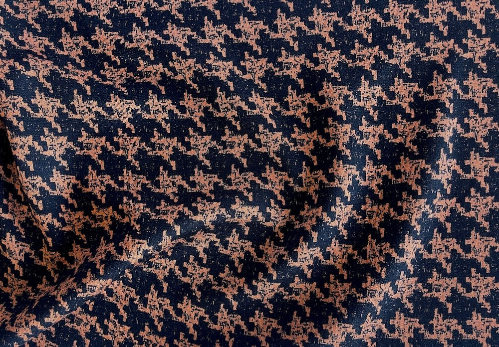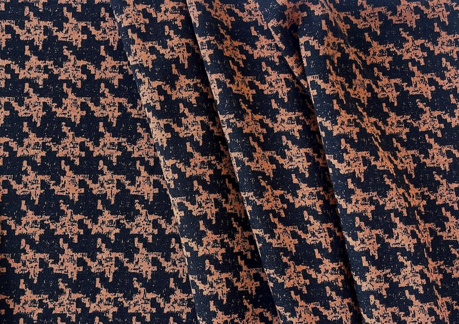 A light to mid-weight rayon viscose blend ponte knit in a coal black and copper houndstooth - with black on the reverse, this drapey, smooth ponte knit is breathable, comfortable, and perfect for travel-wear, sports-wear, tunics, and lounge-wear. Made in the Netherlands. 45% rayon viscose and 55% polyester. 60" wide.