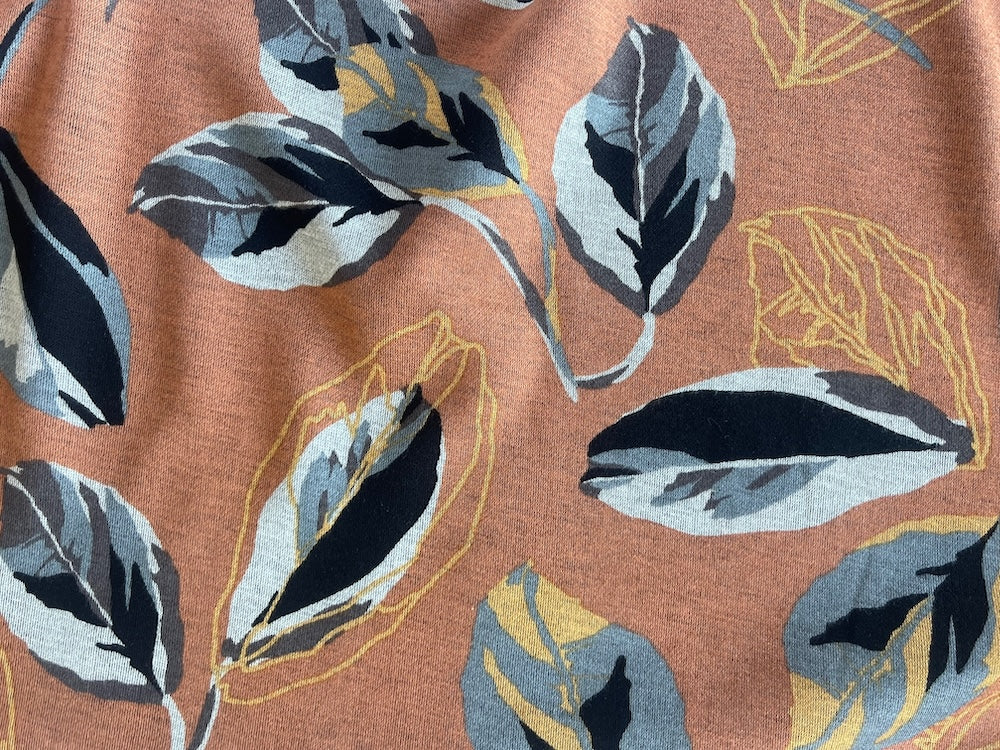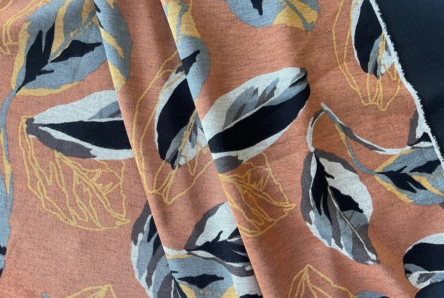 A light to mid-weight rayon viscose blend ponte knit in a design of grey leaves with soft goldenrod outlined "shadows" and on an apricot background - with black on the reverse, this drapey, smooth ponte knit is breathable, comfortable, and perfect for travel-wear, sports-wear, tunics, and lounge-wear. Made in the Netherlands. 45% rayon viscose and 55% polyester. 61" wide.