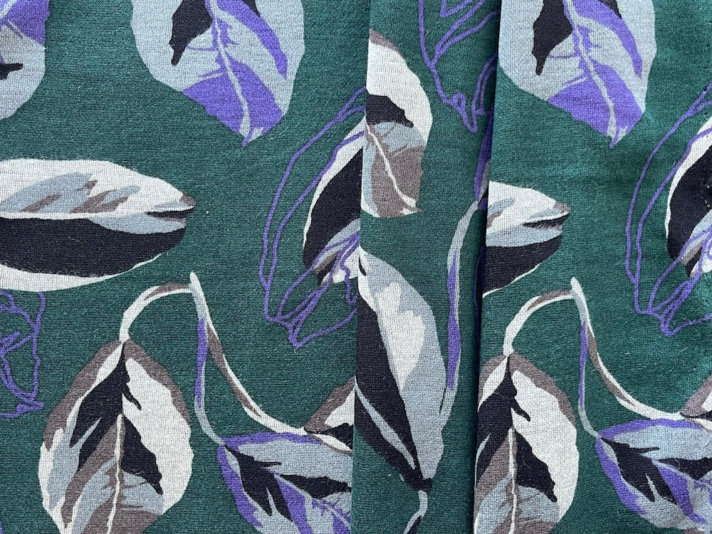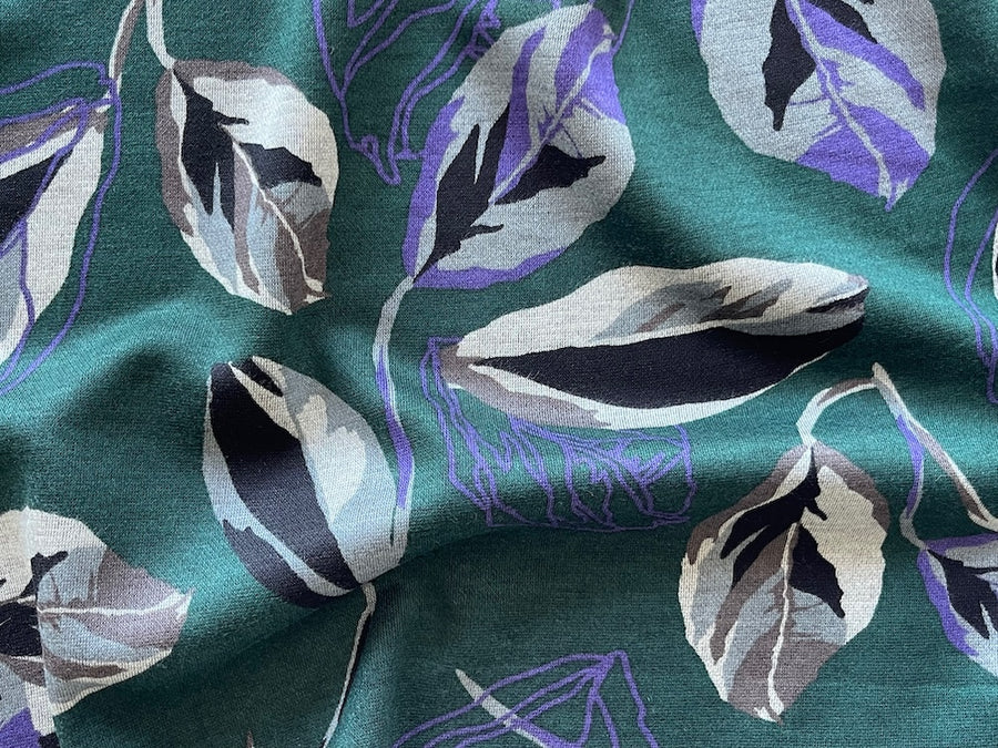 A light to mid-weight rayon viscose blend ponte knit in a design of orchid and grey leaves with outlined "shadows" and on a lush bottle green background - with black on the reverse, this drapey, smooth ponte knit is breathable, comfortable, and perfect for travel-wear, sports-wear, tunics, and lounge-wear. Made in the Netherlands. 45% rayon viscose and 55% polyester. 62" wide.