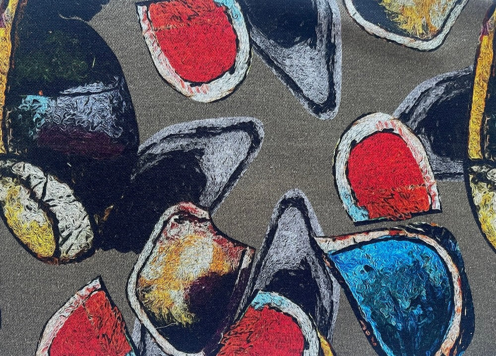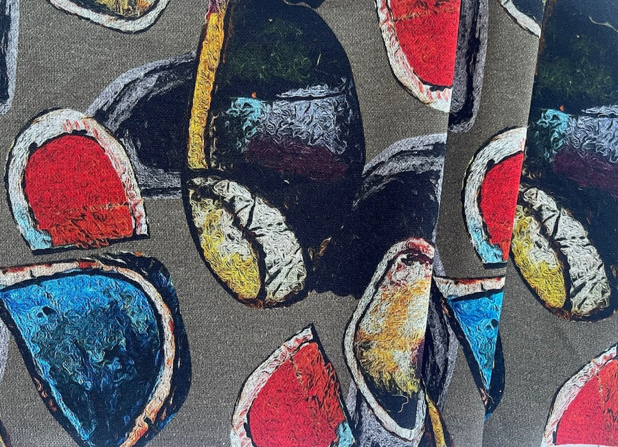 A light to mid-weight rayon viscose blend ponte knit with ocean blue, vermilion, and mustard organic, abstract shapes on an olive storm background - with black on the reverse, this drapey, smooth ponte knit is breathable, comfortable, and perfect for travel-wear, sports-wear, tunics, and lounge-wear. Made in the Netherlands. 45% rayon viscose and 55% polyester. 62" wide.