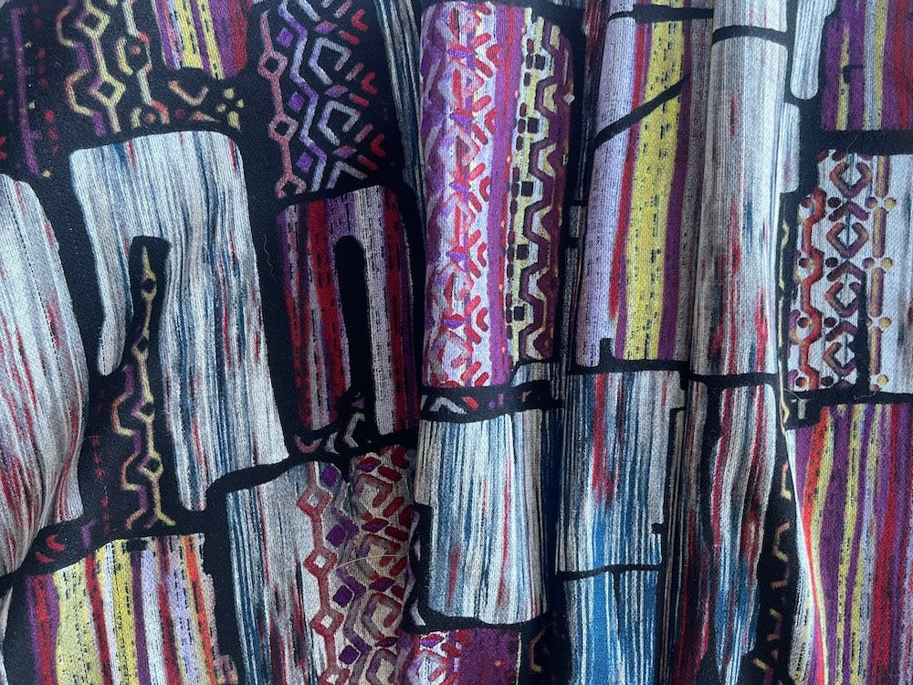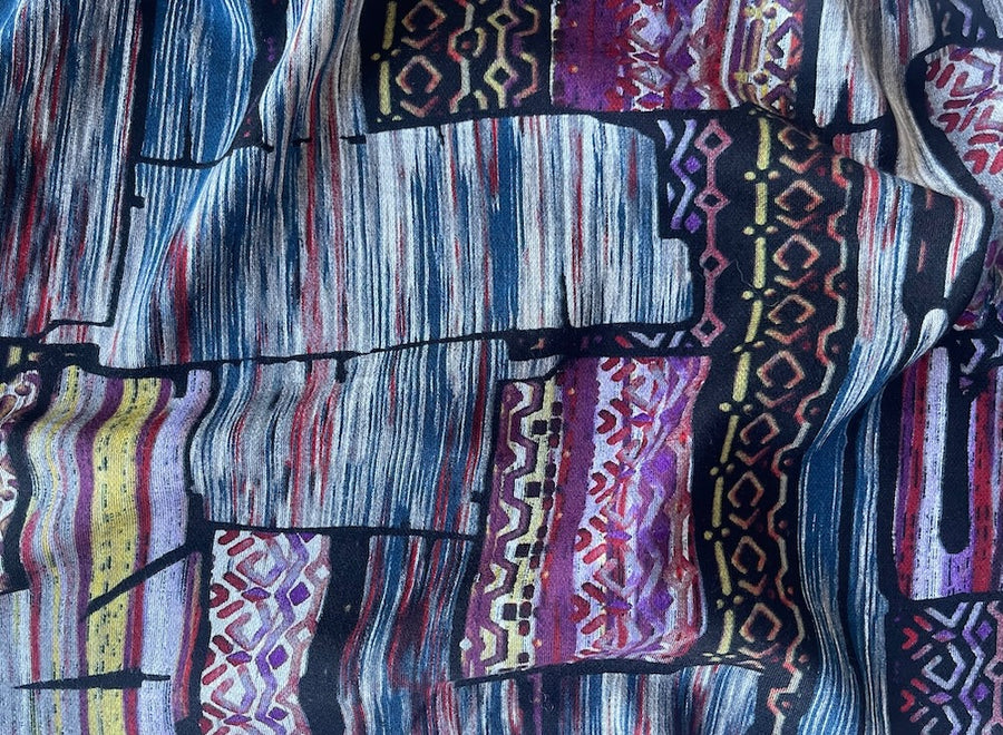 A light to mid-weight rayon viscose blend ponte knit in a mock patchwork boho print in shades of plum violet, lemon, and blue on a black background - with black on the reverse, this drapey, smooth ponte knit is breathable, comfortable, and perfect for travel-wear, sports-wear, summer dresses, and lounge-wear. Made in the Netherlands. 45% rayon viscose and 55% polyester. 60" wide.