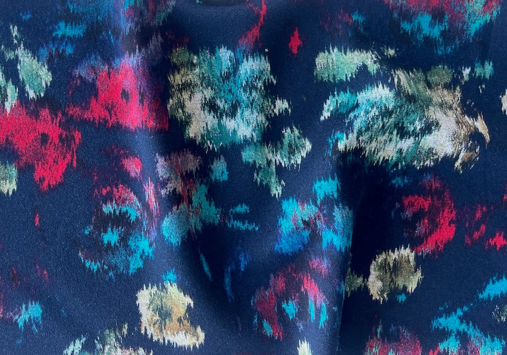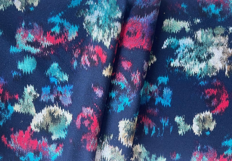 A light to mid-weight rayon viscose blend ponte knit in a print of rainy day flowers on a navy blue background - with black on the reverse, this drapey, smooth ponte knit is breathable, comfortable, and perfect for travel-wear, sports-wear, summer dresses, and lounge-wear. Made in the Netherlands. 45% rayon viscose and 55% polyester. 62" wide.