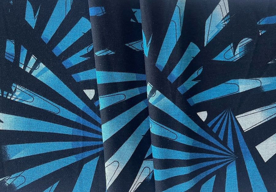 A light to mid-weight rayon viscose blend ponte knit in a large-scale turquoise and white abstract spotlight design on a black background - with black on the reverse, this drapey, smooth ponte knit is breathable, comfortable, and perfect for travel-wear, sports-wear, tunics, and lounge-wear. Made in the Netherlands. 45% rayon viscose and 55% polyester. 62" wide.