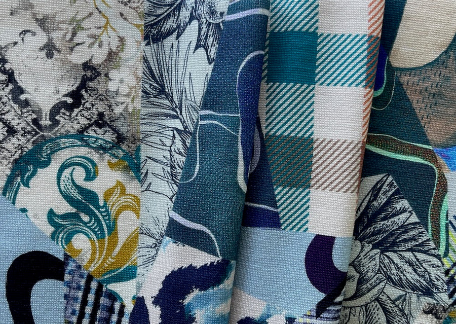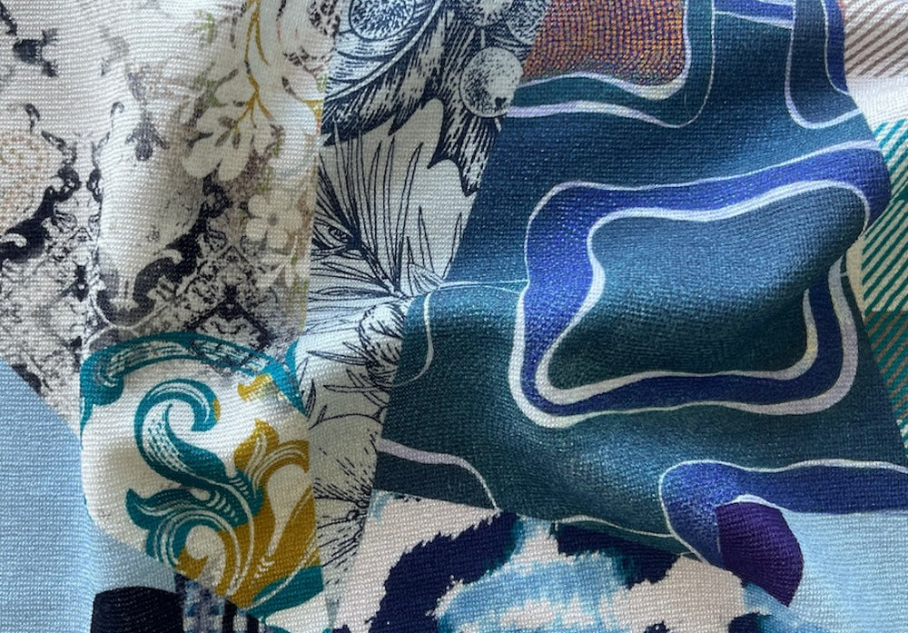 A mid-weight rayon viscose blend ponte knit in a montage of geometric, floral, and scroll-work prints in shades of cobalt, sky blue, teal, rust, beige, black, and ivory - with a touch of lycra for comfort, this drapey, smooth ponte knit is breathable, comfortable, and perfect for travel-wear, sports-wear, pants, and lounge-wear. Made in Italy. 95% rayon viscose and 5% lycra. 54" wide.