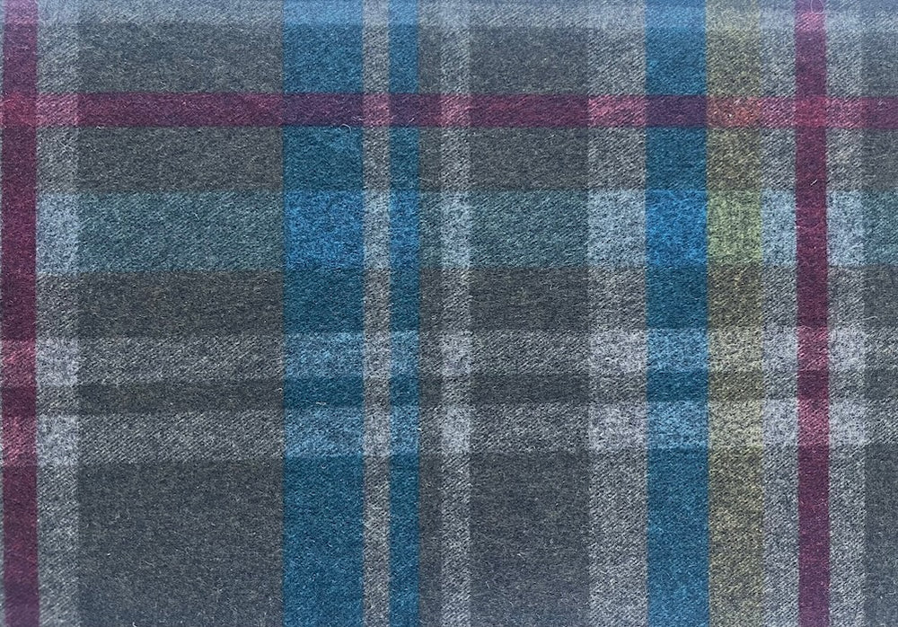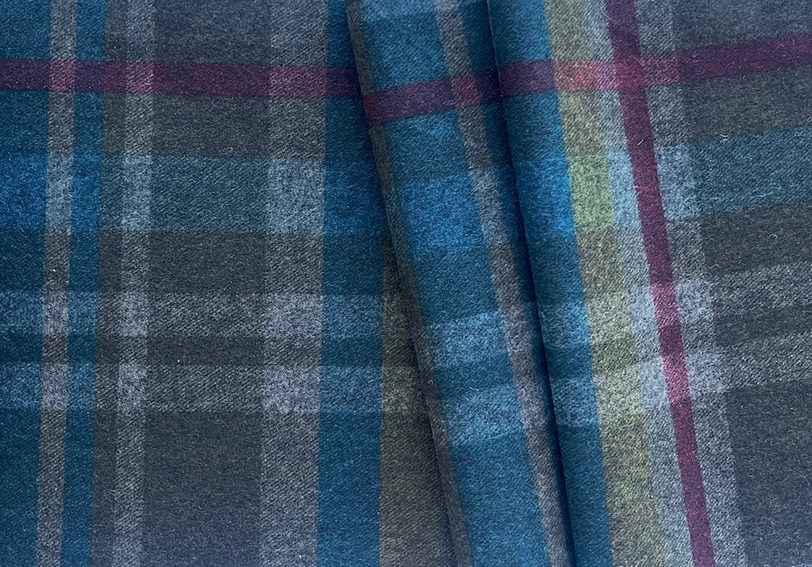 A mid-weight rayon viscose blend ponte knit in a moody olive, wine, dove gray, and ochre plaid - with a touch of lycra for comfort, this drapey, smooth ponte knit is breathable, comfortable, and perfect for travel-wear, sports-wear, pants, and lounge-wear. Reverses to graphite grey. Made in the Netherlands. 80% polyester, 15% rayon viscose and 5% lycra. 59" wide.