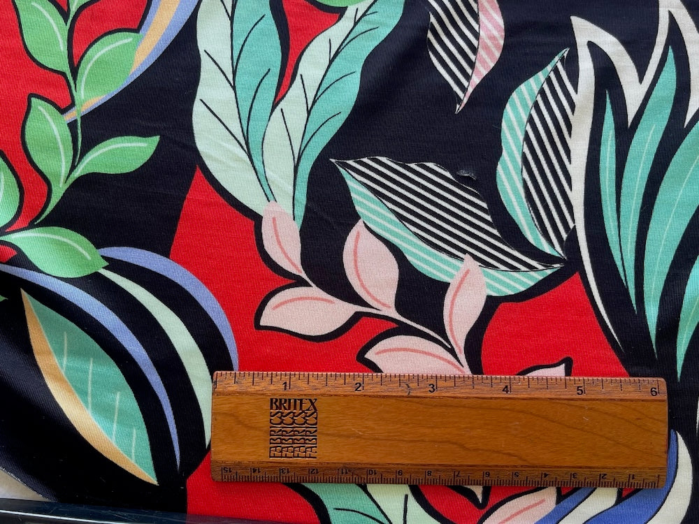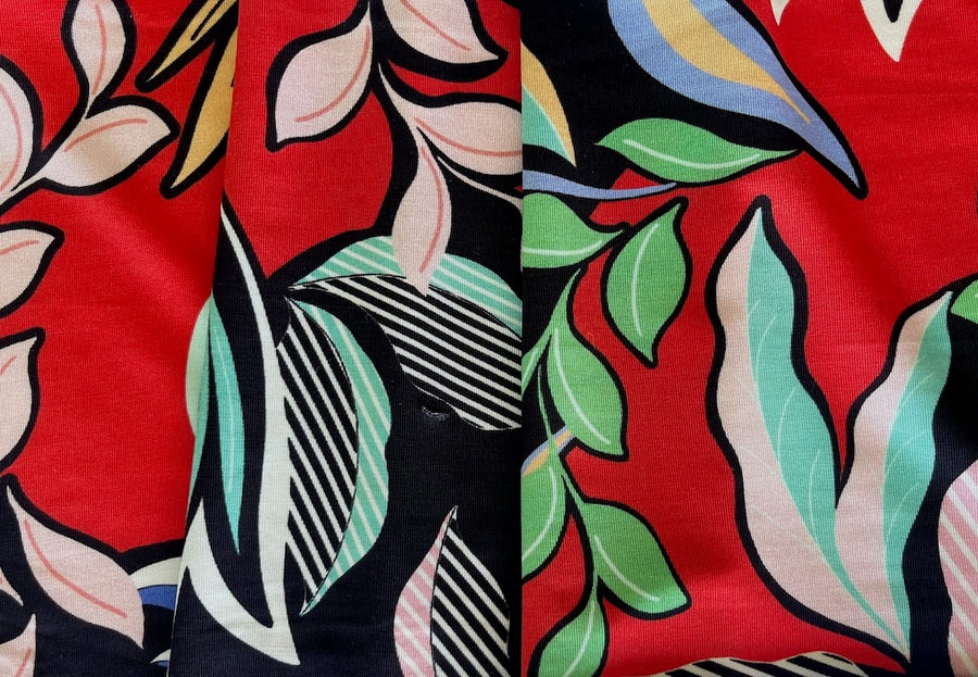 A slinky, rayon viscose jersey knit in an exuberant print of foliage outlined in graphic black and on a lipstick red background - with a touch of lycra for comfort, this knit is sinuous, fluid, and perfect for travel-wear, tops, T-shirts, skirts, wrap dresses, swimsuit wrap, or lounge-wear. Made in Italy. 90% rayon viscose and 10% lycra. 56" wide.
