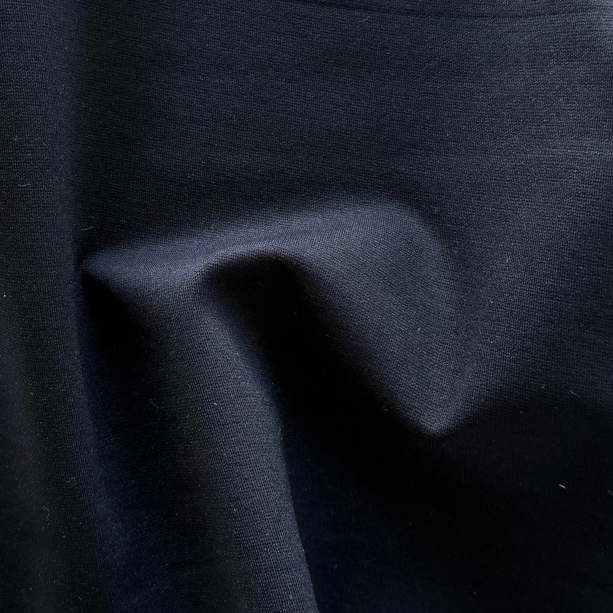 A high quality mid-weight rayon viscose blend ponte double-knit in a classic onyx black - with a touch of lycra for comfort, this supple ponte knit is breathable, cool to the touch, and perfect for travel-wear, sports-wear, and jackets. 60% rayon viscose, 35% nylon, and 5% lycra. 59" wide.