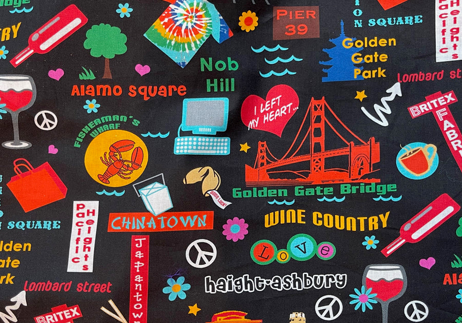 A quilting weight cotton that shows everyone exactly where you left your heart....San Francisco! Representing our much loved landmarks and attractions; The Golden Gate Bridge, Haight Ashbury, Coit Tower, the iconic neon Britex Fabrics sign, Lombard Square, trolley cars, wine country, and more! This fabric is ideal for an apron, quilting projects, or even a nifty camp shirt. 44" wide. 100% cotton.