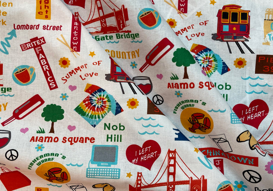 A quilting weight cotton that shows everyone exactly where you left your heart....San Francisco! Representing our much loved landmarks and attractions; The Golden Gate Bridge, Haight Ashbury, Coit Tower, the iconic neon Britex Fabrics sign, Lombard Square, trolley cars, wine country, and more! This fabric is ideal for an apron, quilting projects, or even a nifty camp shirt. 44" wide. 100% cotton.