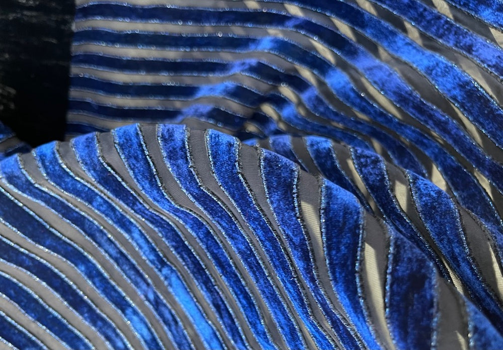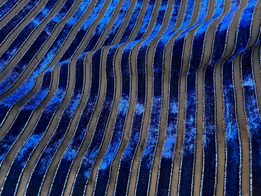A 57" long panel - an elegant couture silk and rayon blend cut velvet in lustrous bright navy velvet and sheer black organza , accented with delicate glitter-edged stripes, and with a decorative 3" band of black velvet on one end of the panel - this dressy cut velvet is perfect for a gorgeous dress, a tunic top, or glamorous wrap. Made in Italy and from a well known, high-end designer. 50% silk and 50% rayon viscose. 54" wide.