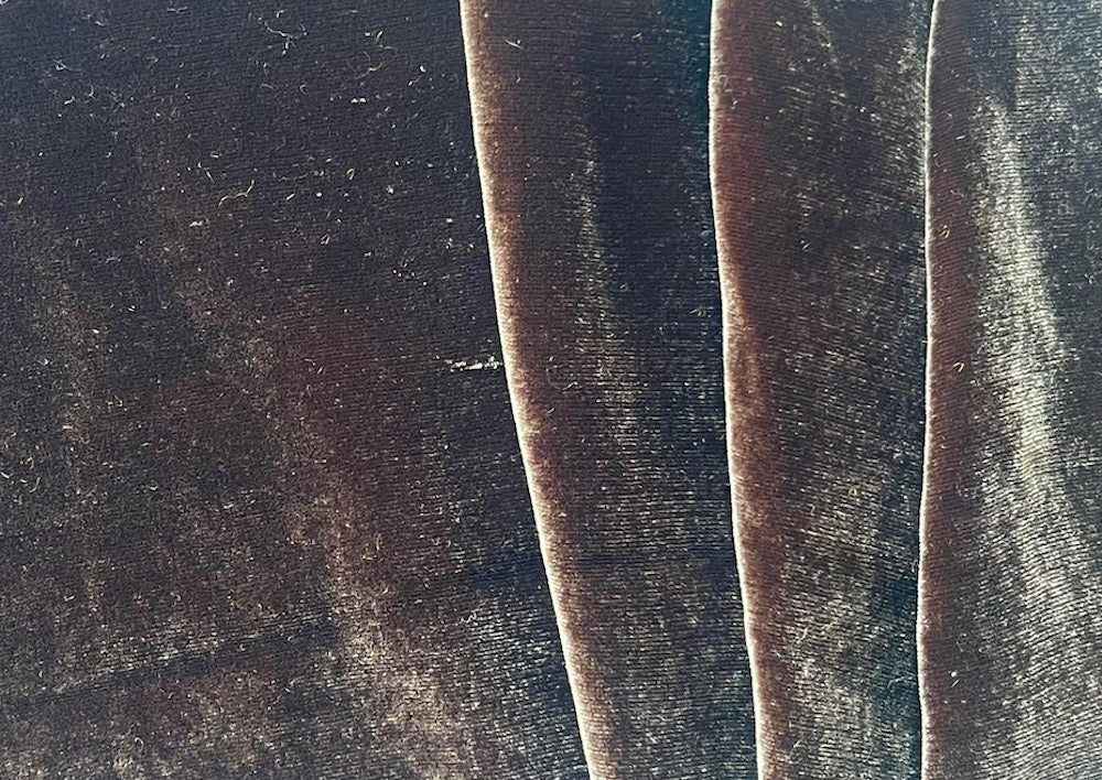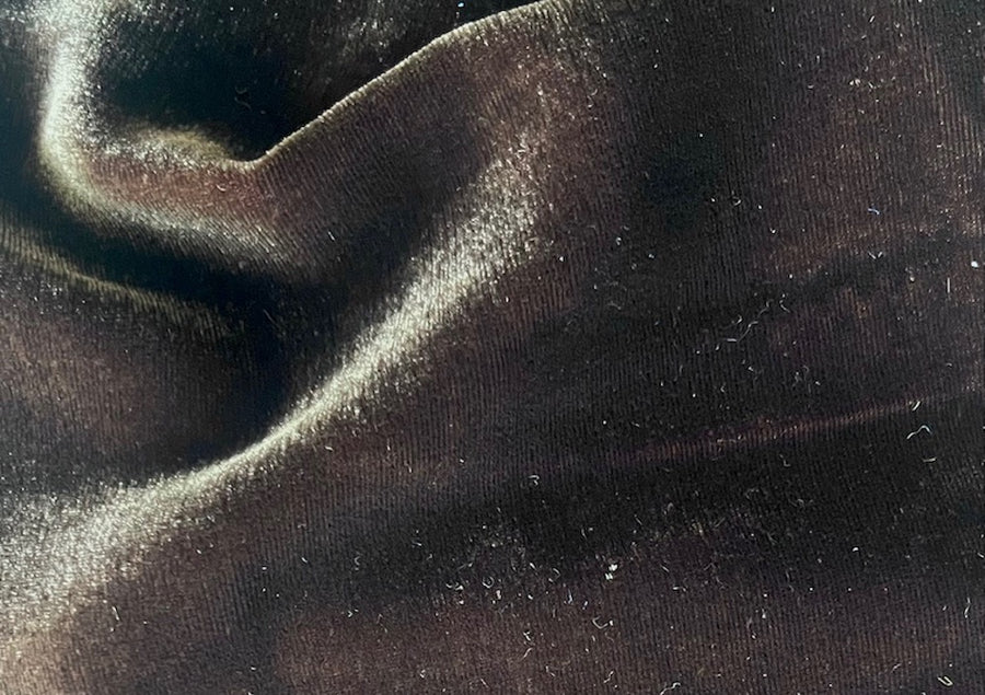 An elegant, plush rayon and silk blend velvet in saturated wenge brown- with a subtle coloration and liquid drape, this supple velvet is perfect for tops, a long skirt, a dress, special occasion decor, or a wrap. 82% rayon and 18% silk blend. 45" wide.
