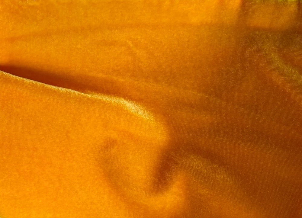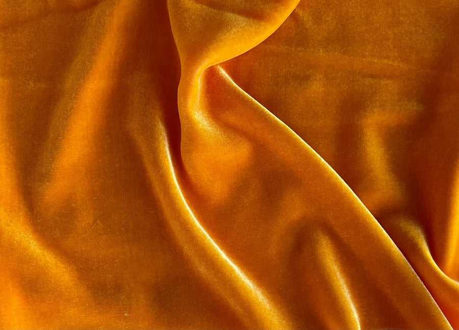 An elegant, plush rayon and silk blend velvet in lustrous iridescent oranged saffron - with liquid drape, this supple velvet is perfect for tops, a long skirt, a dress, special occasion decor, or a wrap. 80% rayon and 20% silk blend. 45" wide.