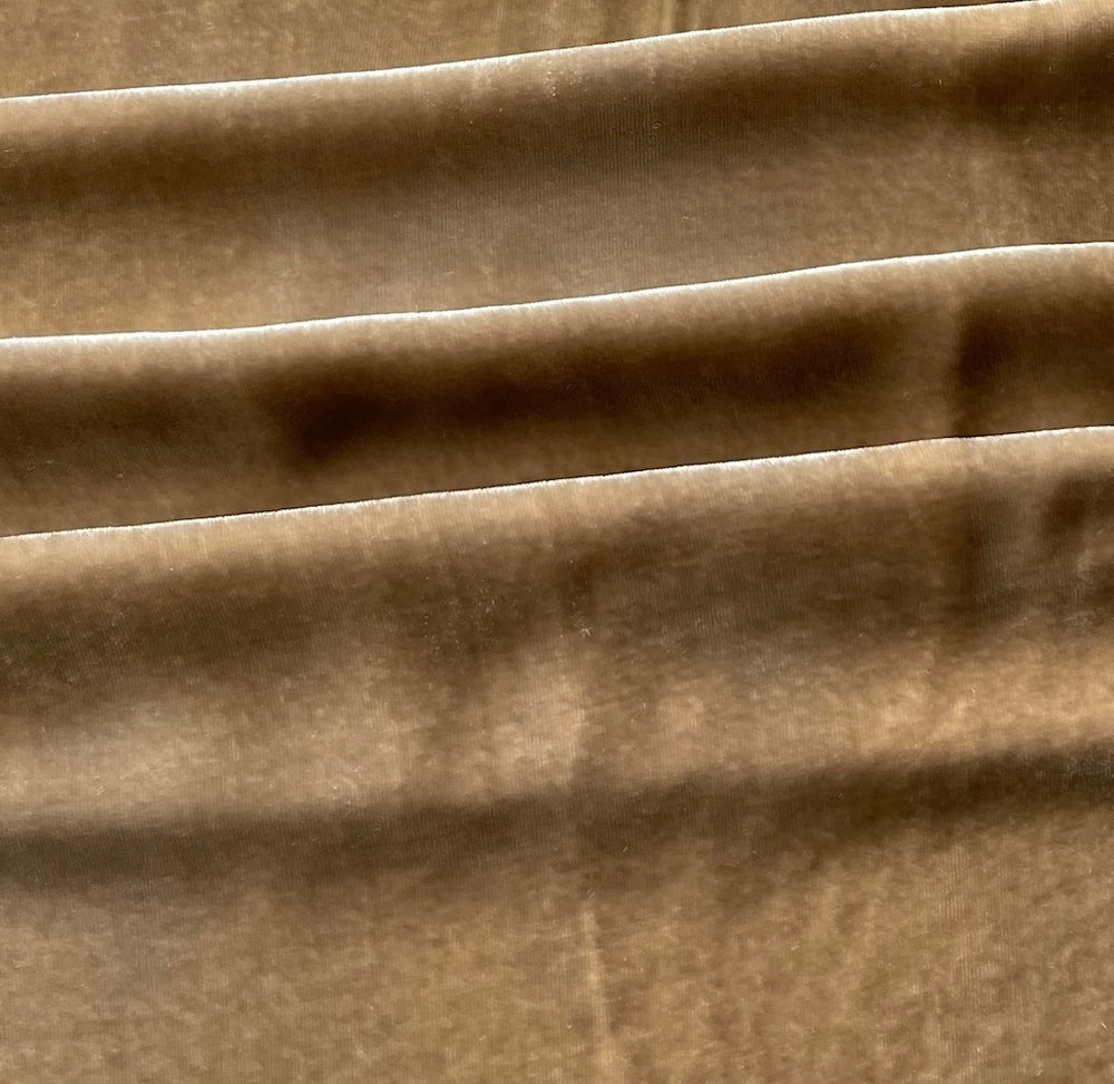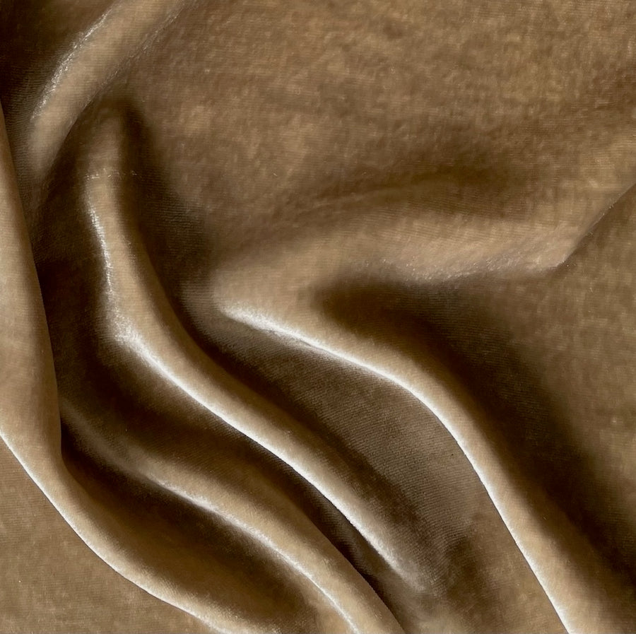 An elegant, plush rayon and silk blend velvet in a beautifully neutral shade of camel - this lustrous, fluid velvet is perfect for drapey tops, a cocktail skirt, a dress, or a wrap. Made in Italy. 80% rayon and 20% silk blend. 54" wide.