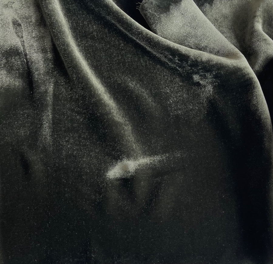 An elegantly supple rayon blend velvet in Olive Thyme Green - this fluid, romantic velvet is perfect for tops, a long skirt, a dress, special occasion decor, or a wrap. Limited yardage. Made in China. 80% rayon and 20% silk. 45" wide.