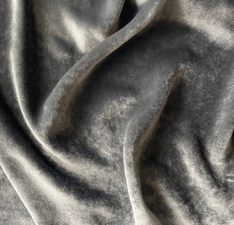 An elegantly supple rayon blend velvet in Stormy Weather Grey - this fluid, plush velvet is perfect for tops, a long skirt, a dress, special occasion decor, or a wrap. Limited yardage. Made in China. 80% rayon and 20% silk. 45" wide.