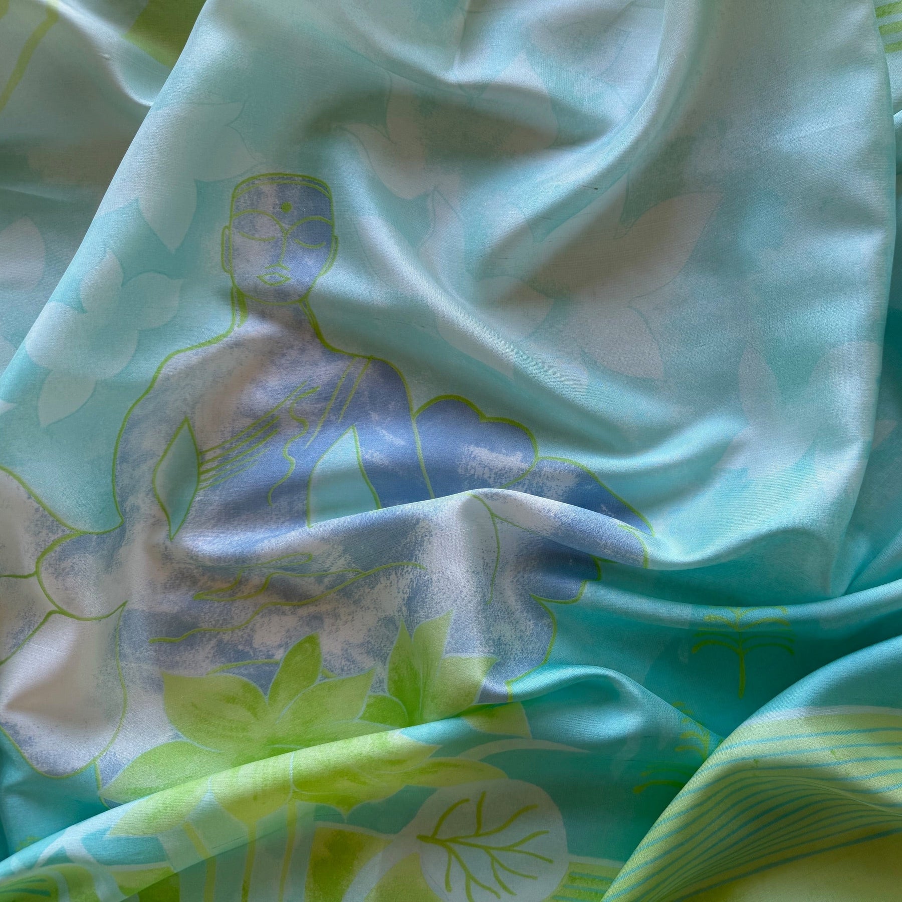 An airy silk habutai panel of a gentle Buddha sitting on a cloud with simple striped borders, all in soft pastel shades of kiwi, sky blue, baby blue, and white - this ethereal panel would make an exquisite scarf, a stunning paneled skirt, or a blouse. Made in Italy. 100% silk. 54" wide.