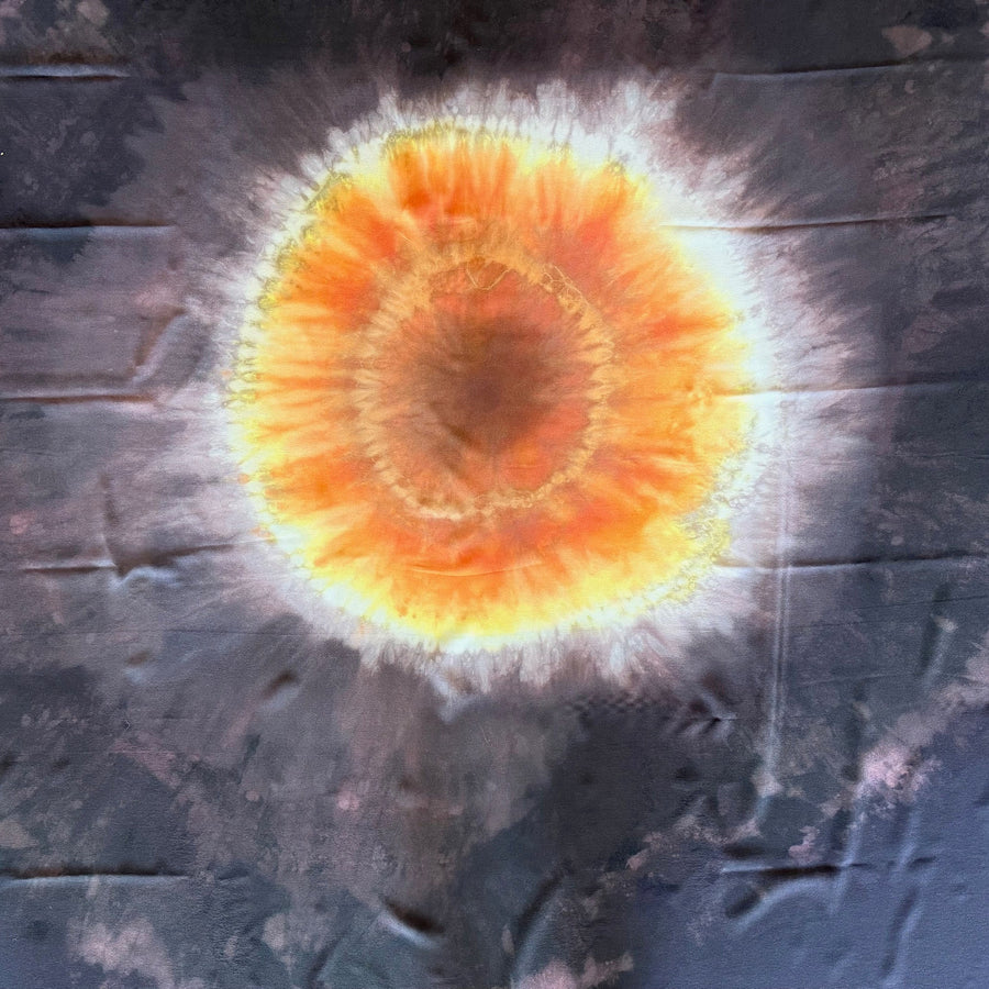 An airy silk habutai panel of an orange glowing retinal sun in a deep purple sky - this gorgeous panel would make an exquisite scarf, a stunning paneled skirt, or a blouse. Made in Italy. 100% silk. 55" wide.