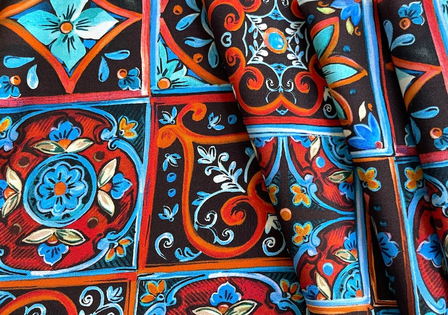 A high-end matte silk satin charmeuse in a print of brilliantly colored Italian tile-work in shades of vermilion, turquoise, and cornflower blue on a jet black background -- with the satin side on the reverse, this couture stretch silk is a slithery delight to wear and is perfect for a blouse, a wrap dress, swishy palazzo pants, or a jacket lining. Made in Italy. 96% silk and 4% lycra. 54" wide.