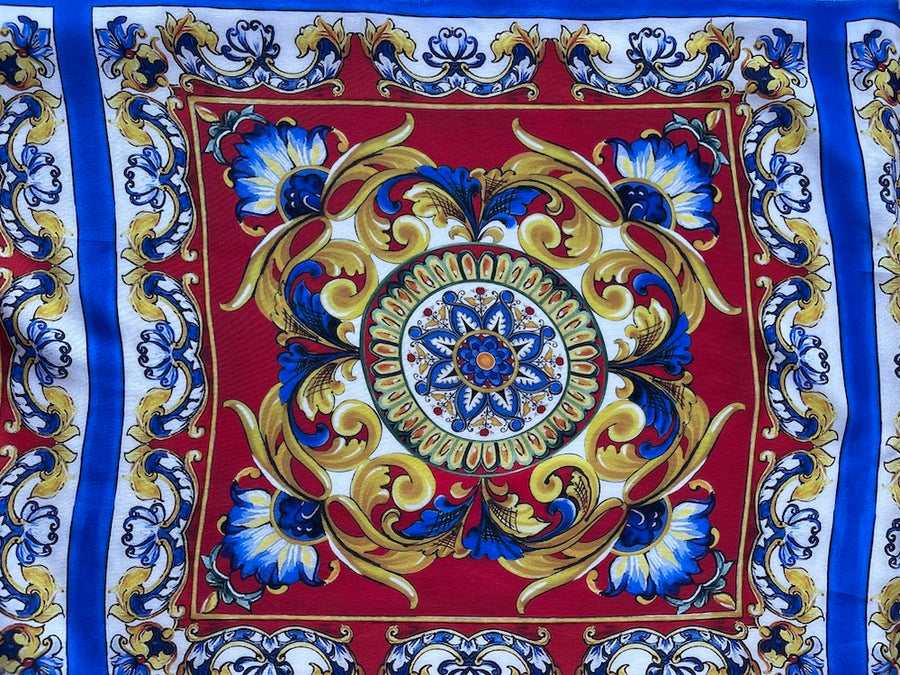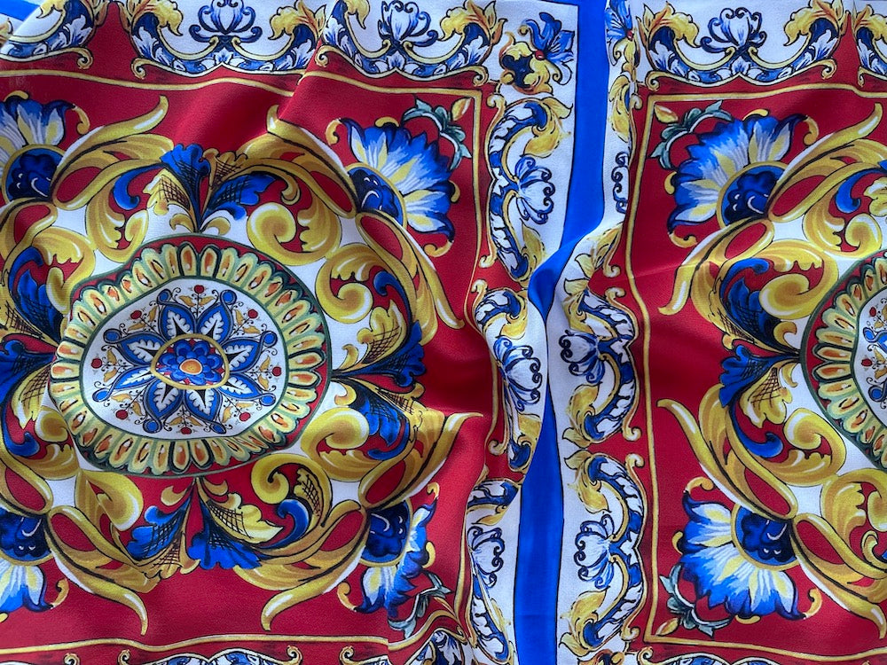 A high-end, couture silk crepe de chine in a print of brilliantly colored Arabesque Italian 16" x 16" tile-work in shades of lacquer red, golden wheat, cobalt, and white - this stunning and vivid silk is perfect for an elegant blouse and skirt, a classic sheath dress, or snazzy palazzo pants. Made in Italy for a well-known house of couture. 100% silk. 54" wide.