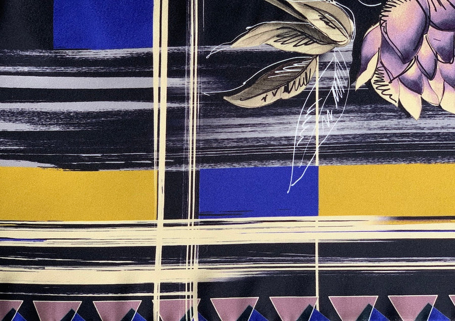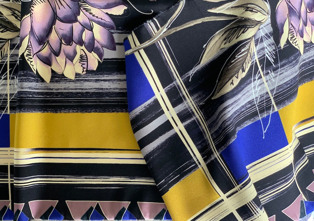 A designer silk charmeuse, with the print on the crepe side of the fabric. The design is a bold geometric with lotus flower accents, all in royal purple, mustard, lilac, vanilla, and gray on a black background! Perfect for a simple sheath, tunic or long evening dress. Limited yardage. Made in Italy for Etro. 100% silk. 53" wide.