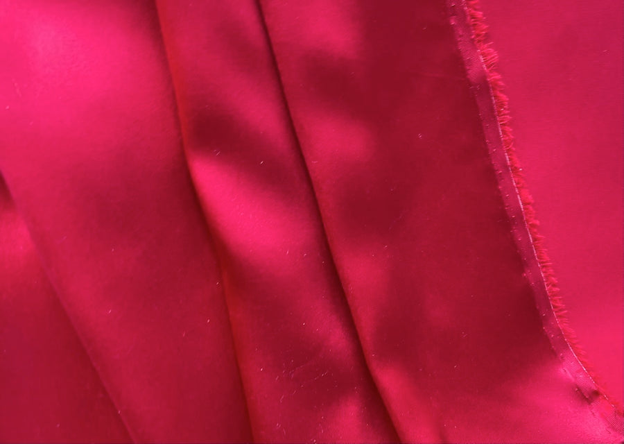 A mid-weight stretch silk satin charmeuse in femme fatale lipstick red - with a hint of lycra, this elegant, fluid silk is perfect for comfort and fit! Create a blouse, a dress, lingerie, lining, or a tunic. Made in Italy. 96% silk and 4% lycra. 54" wide.