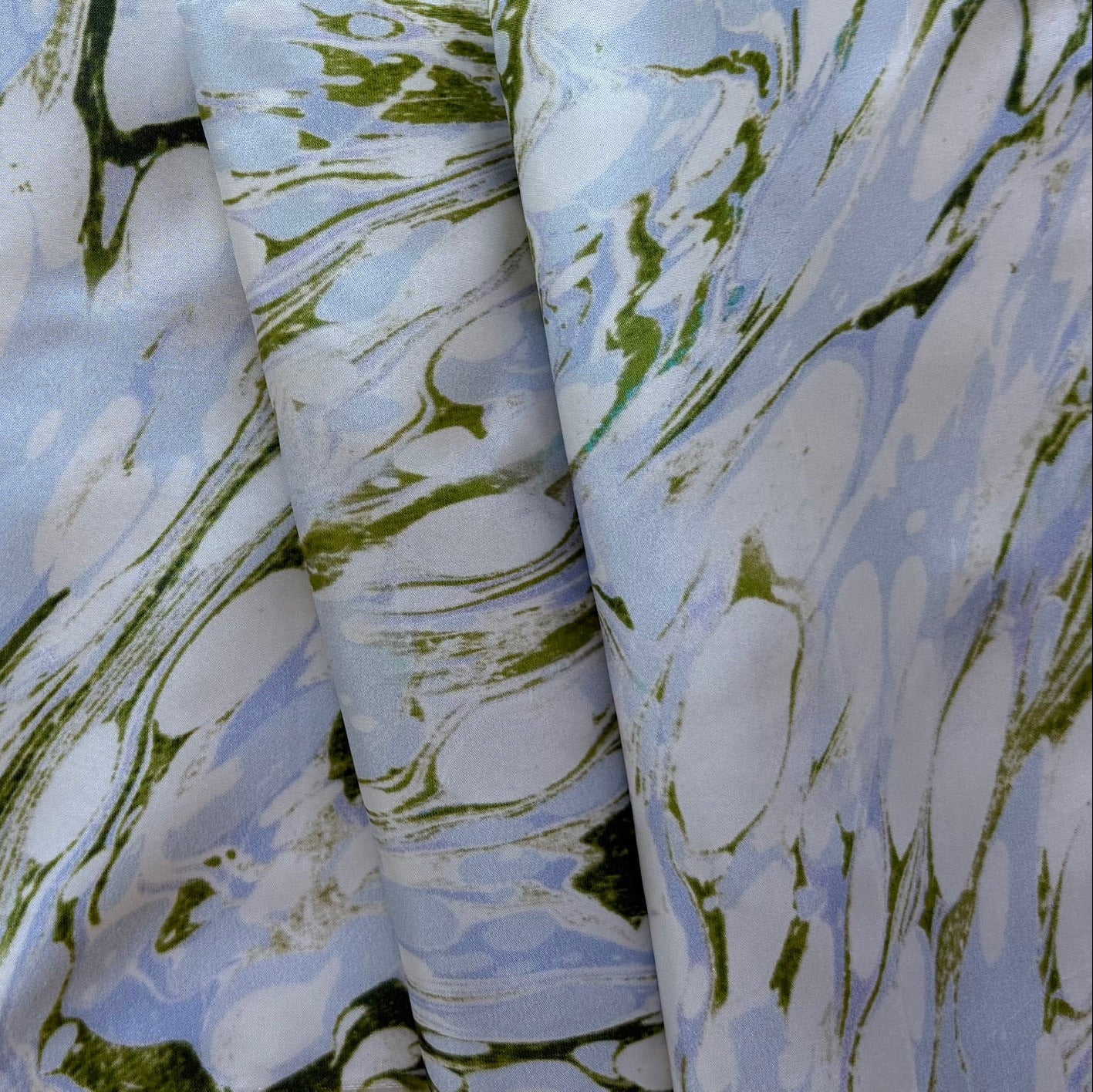A crisp silk taffeta in a sky blue, limeade, and white Florentine marbled print - this classic, silk is perfect for a holiday skirt or a summer frock. Made in Italy. 100% silk. 56" wide.