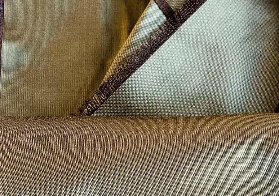 A heavier crisp super silk mock broadcloth in ancient bronze with a cool olive undertone. This lustrous silk shimmers lightly, shapes well, and smooths out wrinkles easily -- great for a gown, a wrap, table coverings, pillows, evening coats, or more. 100% silk. 55" wide.