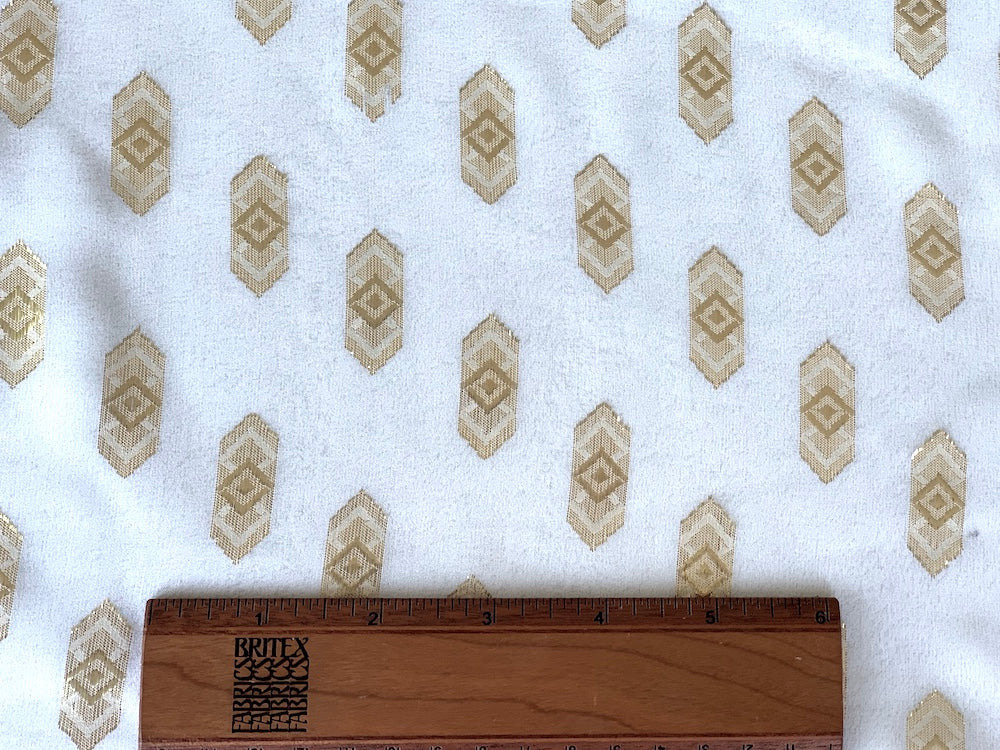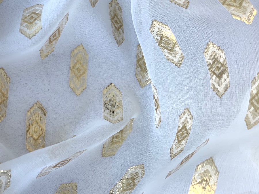 A silk and lurex chiffon with an all-over woven, gold metallic, double-headed arrow, geometric design - simple elegant and timeless, this silk chiffon is perfect for a dramatically full skirt, palazzo pants, or a sweeping dress. Made in Italy and from the house of Hermès. Silk and lurex blend. 55" wide.