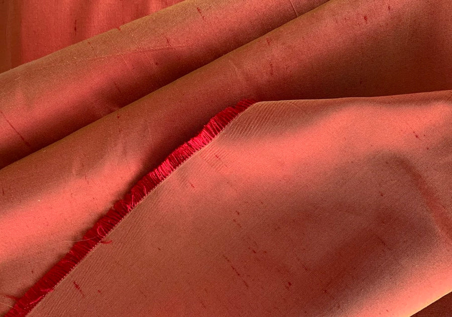 A crisp super silk shantung in an iridescent autumnal shade of pumpkin red-gold. This lovely super silk shantung shimmers lightly, shapes well, and smooths out wrinkles easily -- great for a gown, a wrap, table coverings, evening coats, or more. 100% silk. 53" wide.