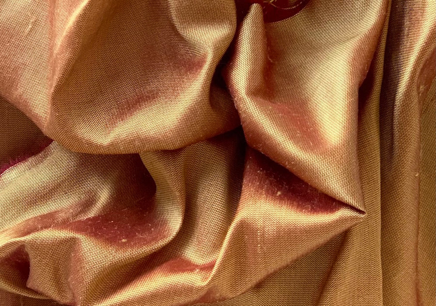 A crisp silk shantung in iridescent saffron with cranberry undertones. This lovely silk shantung shimmers lightly, shapes well, and smooths out wrinkles easily -- great for a gown, a wrap, table coverings, evening coats, or more. 100% silk. 54" wide.