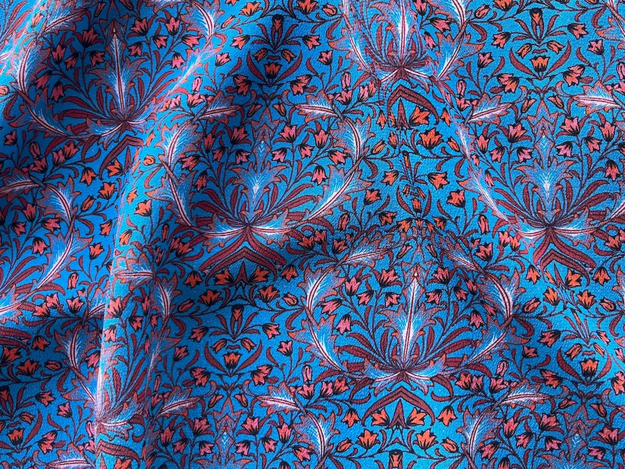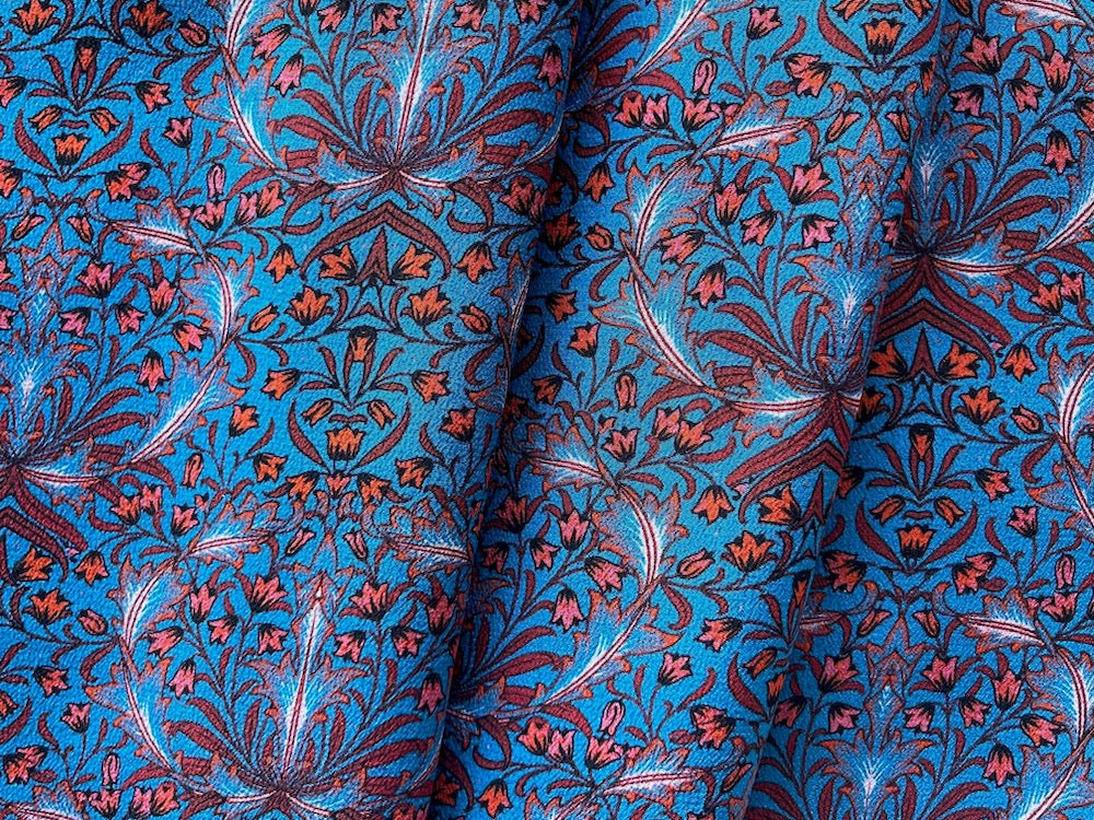 A classic silk crepe de chine in a print of bluebells and scroll-work in shades of coral and brick red on a vivid ocean blue background - this elegant crepe de chine is perfect for blouses, tunics, or dresses. Made in Italy for Liberty of London. 100% silk. 54" wide.
