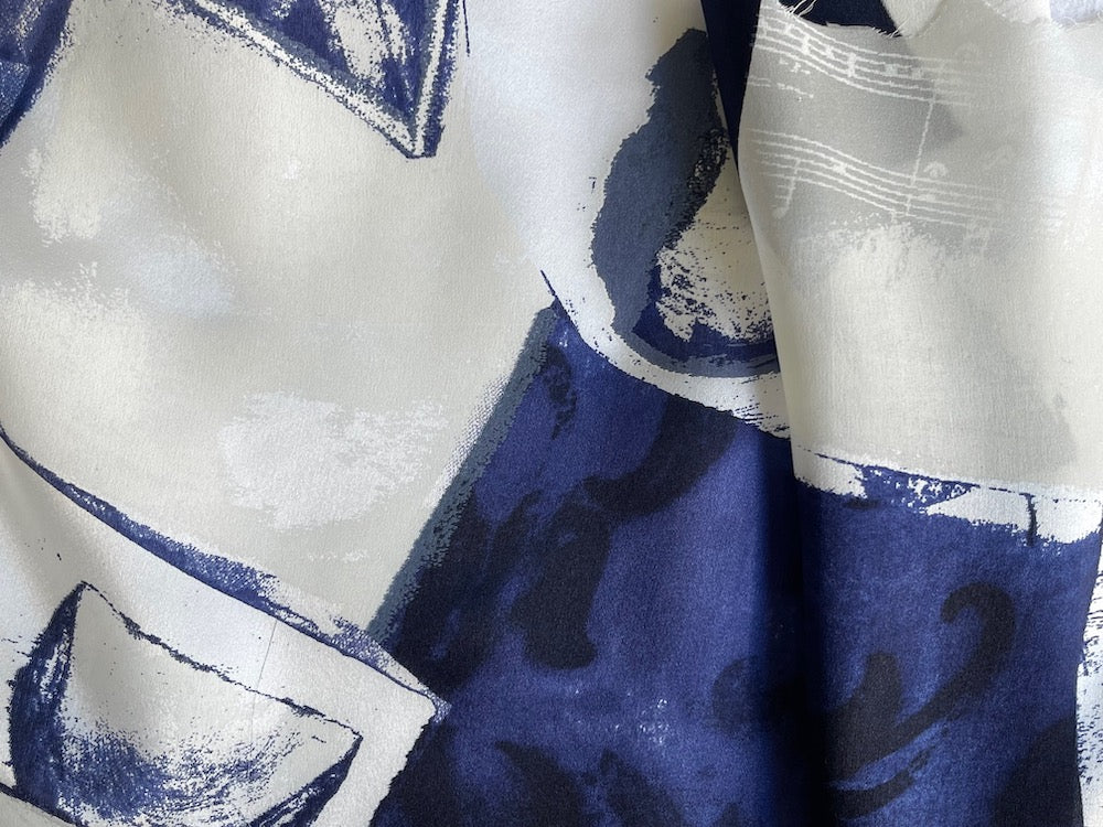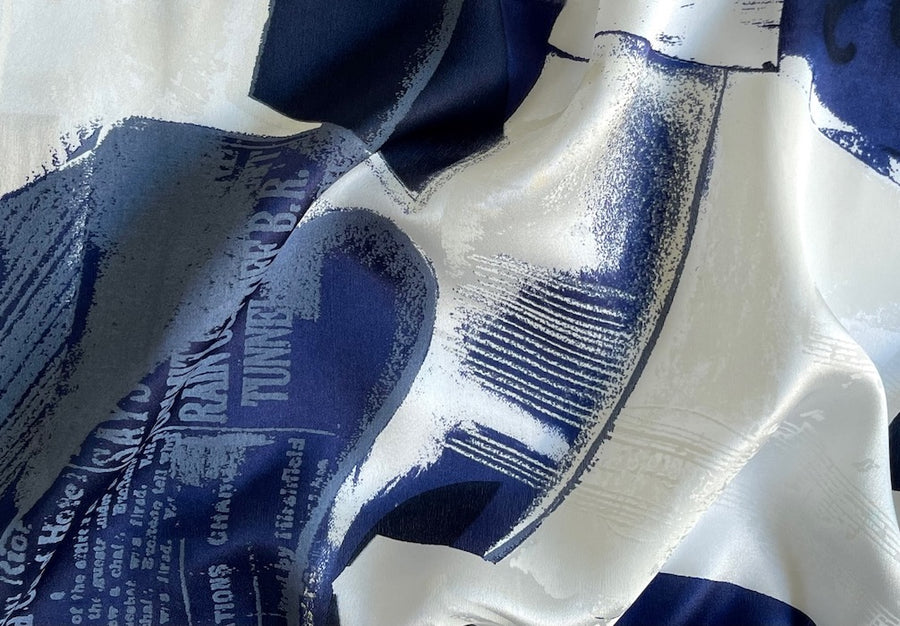A lighter-weight silk satin charmeuse in a large-scale print of typography and musical notation in clear shades of navy blue and white - this airy, fluid silk is perfect for a blouse, an symmetrical top, or a jacket lining. 100% silk. Made in Italy. 57" wide.