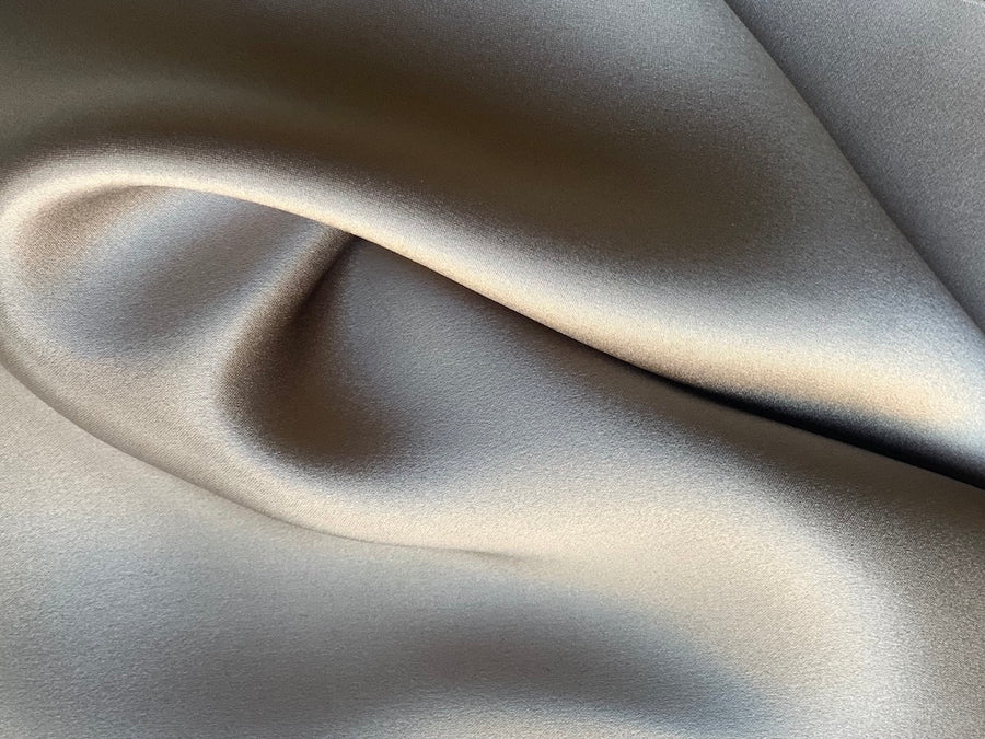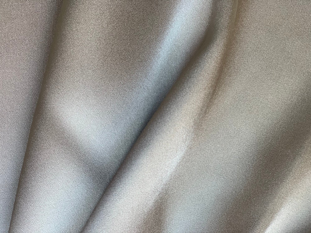 A fine quality silk satin charmeuse in pale, lustrous mushroom - this luxurious silk satin charmeuse is marvelous for blouses, palazzo pants, linings, or risqué pajamas. Made in Italy. 100% silk. 54" wide.