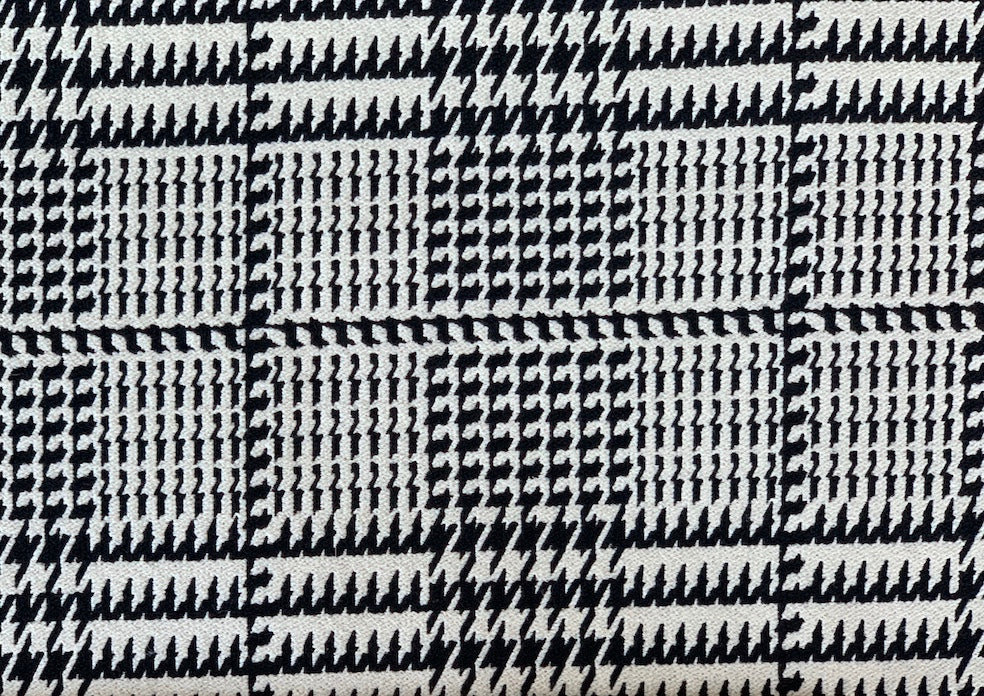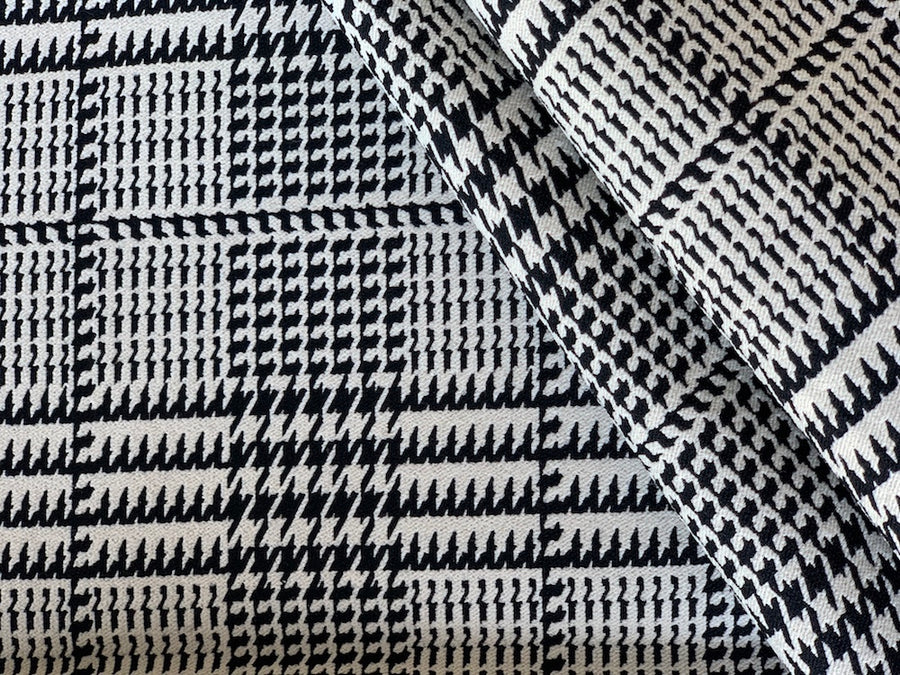 A double-faced silk blend bouclé suiting in a black and ivory mock Glen plaid - this classic wool is perfect for a springtime coat, a jacket, or slacks. Made in Italy and used by a high-end NY designer. 50% silk and 50% poliamide blend. 44" wide.