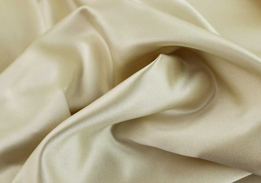 A duchess silk satin, in a gleaming palest antique gold - perfect for a bridal gown, structured cocktail dress, or an elegant evening wrap. 100% silk. 58" wide.